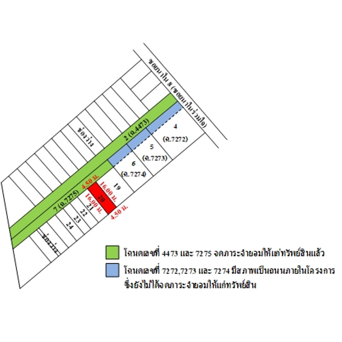 The land is rectangular. The size of the land plot on the north side next to the road is approximately 4.5 m wide, approximately 16 m deep, 4 floors with a rooftop, number 160/53 The road passes in front of the property. It is a private road. The reinforced concrete road surface is approximately 6 m wide. The road area is approximately 8 meters wide, including - Land title deeds no. 7275 and 4473, land numbers 7 and 2. The servitude to convert the property has already been registered - Land title deeds no. 7272, 7273 and 7274, land numbers 4, 5 and 6. The servitude to convert the property has not yet been registered. The reinforced concrete road surface is approximately 6 m wide. The road zone is approximately 8 m wide. Note: - The property is located in a residential, commercial and tourist area of Phuket. Complete utilities - Nearby important places include Patong Hospital, Patong Police Station, Jungceylon Department Store, Patong and Central Patong, etc. - The property is located in other legal regulations. Announcement of the Ministry of Natural Resources and Environment In the area of Phuket Province (No. 2) 2020, with the property located in the area 8 If interested, contact Oil Contact number