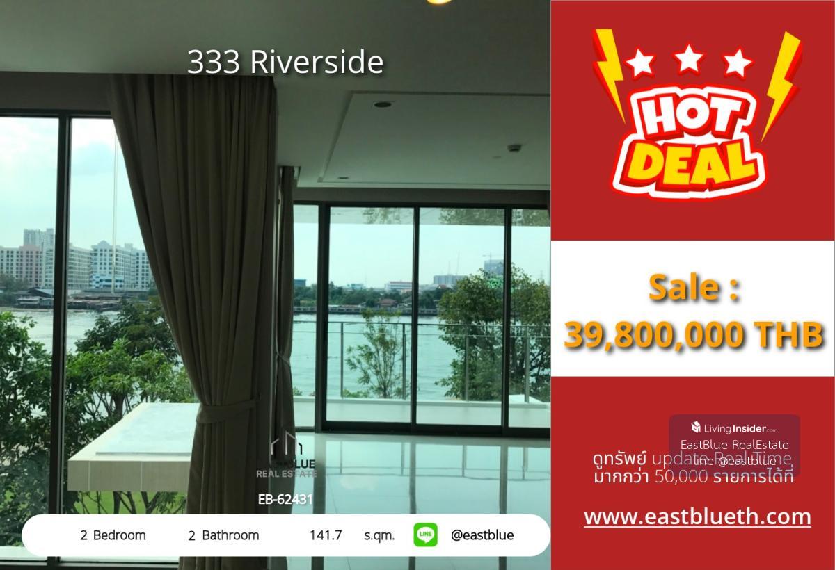 Luxury condo with a view of the Chao Phraya River "333 Riverside" for sale, with a spacious area of 141.7 sq.m. 2 bedrooms, 2 bathrooms, modern design, every square meter meets urban living needs Price: only 39,800,000 THB, a golden opportunity for those seeking convenience, close to the Bang Pho BTS station, easy access to the city center Facilities within the project • Luxuriously decorated Main Lobby • Swimming pool with a children's pool • Jacuzzi • Green Canopy relaxation area • Fully equipped fitness center • Business meeting room • Reading room • Riverside garden and Riverfront Terrace • Digital Door Lock and Key Card Access system Nearby locations • Blue Line BTS, Bang Pho station in front of the project • Blue Line and Purple Line BTS, Tao Poon station 1.2 km • Bang Pho market 300 m • Sri Khama market 1.3 km • Lotus Prachachuen 1.6 km • Bang Chao market 2.9 km • A.T.K. market 4.2 km • Chatuchak 4.7 km • Central Ladprao 6.8 km • King Mongkut's University of Technology North Bangkok 2.4 km • Army Transportation School 50 m • Chatuchak Park 4.7 km • Bang Pho Fire Station 550 m Meets urban living needs, close to all conveniences, with a spacious private area waiting for you to own For inquiries, please contact urgently EB-62431 #333Riverside #BangPhoCondo #RiverViewCondo #HouseAndCondo #BangPhoBTS