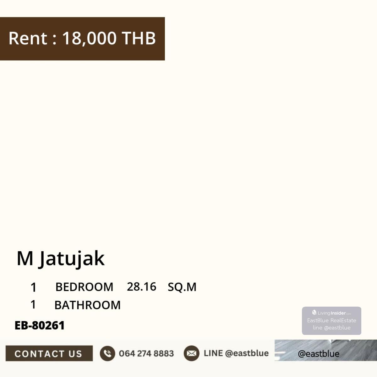 Rent a condo at a good price, ready to move in, in the city center near BTS/MRT Meet the M Jatujak condo, 1 bedroom, 1 bathroom, size 28.16 sq.m. Suitable for working people or students in the Chatuchak area Rental price is only 18,000 baht/month Convenient transportation, near Mo Chit BTS and Chatuchak MRT Project highlights • 24-hour security system • Large fitness and swimming pool • Relaxing garden Nearby places • Mo Chit BTS only 0.6 km • Chatuchak MRT 0.8 km • Chatuchak Park 1.0 km • Chatuchak Weekend Market 1.2 km • Paolo Memorial Hospital 3.5 km • Kasetsart University 3.8 km Interested? Contact us today to view this value-for-money condo, ready to move in, close to all urban conveniences #M_Jatujak #CondoForRent #Chatuchak #CondoNearBTS #ReadyToMoveIn