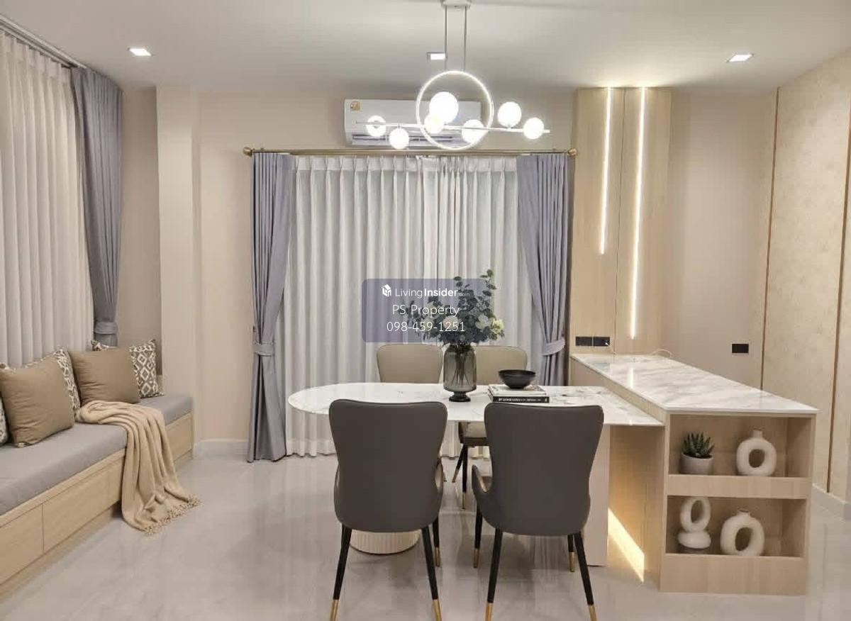 Price: 120,000 baht / month Usable area: 237 sq.m. Area: 53.2 sq.w. Floor: 2 4 bedrooms / 4 bathrooms / 1 living room / 2 parking spaces Amenities: CCTV, key card Access, fitness center, swimming pool, 24/7 security guard, co-working area, common area. Furniture included: TV, microwave, sofa, refrigerator, bed, air conditioner, water heater, Smoke Dispenser, shelf, TV cabinet, wardrobe, center table. House for rent! convenient transportation, near BTS, near the expressway, fully furnished Ready for viewing. Interested please contact: 📞Call center: Contact number 📱Hotline: Contact number 📲Whatsapp: Contact number 🖱️Line: @psproperty https://lin.ee/d8bpOBs Website: https://www.ps-property.co.th/