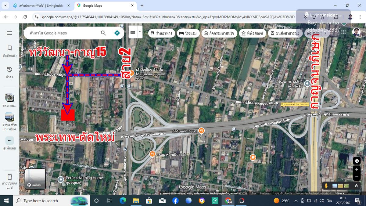 Land filled in, 100 square wah, size 20x20 meters, Sin Phatthana Thani Village, Phutthamonthon Sai 2. Thawi Watthana-Kanchanaphisek15 Corner plot along the main road, build a beautiful house, close to Sai 2, only 500 meters, near Phran Nok-Sai 4 Road. Transportation is convenient. Can be used on many routes. Contact Boy Anucha Remax Greenway Contact number Line ID Contact number Type - empty land, no buildings Project - Sinpatthana Thani Village. (Phutthamonthon Sai 2) Location-Thawi Watthana-Kanchanaphisek Road 15, Thawi Watthana Subdistrict, Thawi Watthana District, Bangkok Land area-100 Square wa usable area-400 Square meters Direction in front of the property - North and West Location - Phutthamonthon Sai 2, Phran Nok Sai 4, Thawi Watthana Kanchanaphisek 15, Kanchanaphisek Land for sale to build a house, 100 square meters, corner plot of Main Road, next to the road on 2 sides, already filled in, Sinpatthana Thani Village. (Phutthamonthon Sai 2) has 24 hour security guard. The land is 200 meters from the alley entrance to the village, 500 meters from Phutthamonthon Sai 2 to the land. Within the village there are both single houses, twin houses, wide main roads, the village is quiet and private , convenient to travel. Near many roads Phutthamonthon Sai 2 Road Phutthamonthon Sai 3 Road Thawi Watthana-Kanchanaphisek Road Phra Thep Tad Mai Road Kanchanaphisek Road, Phetkasem Road, Utthayan Road, Borommaratchachonnani Road , near the Elderly Care Center Baan Kanlapaphruek Na Thaweewattana near Thipangkorn Kanlayaphat School (Thaweewattana) near Khlong Thaweewattana School near Thonburi Market Sanam Luang 2 Near Bangkok Thonburi University Near Paseo Mall Near Sanam Luang 2 Near Thawi Watthana District Office Near Wong Charoen Market Plot coordinates 13.75452586 , 100.39164278