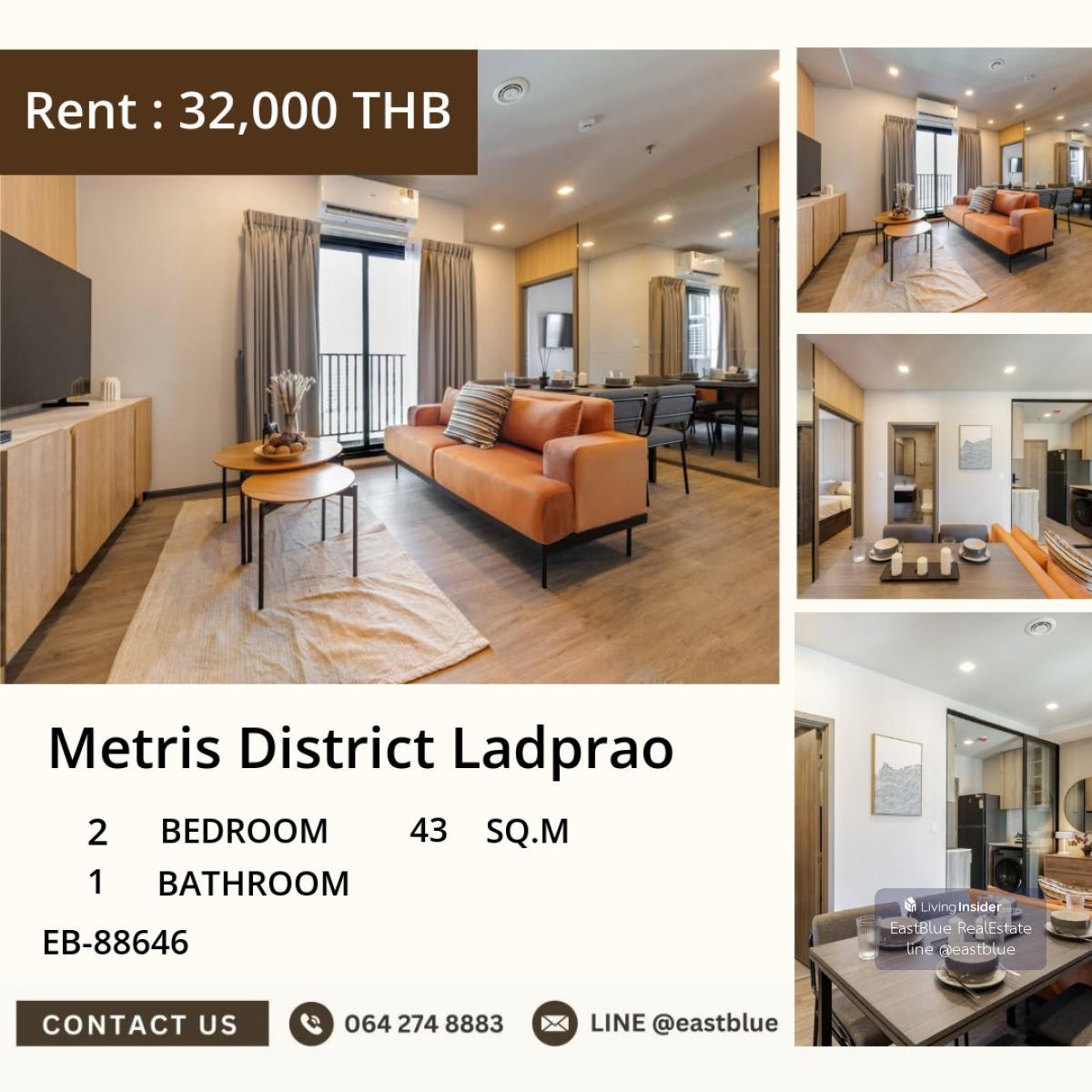 Condo for rent in the heart of Ladprao, ready to move in! "Metris District Ladprao" 2 bedrooms, 1 bathroom, 43 sq.m. Rent price only 32,000 Baht/month Perfect for urban lifestyle, convenient transportation near BTS/MRT Phahonyothin Prime location near important places • Union Mall just 240 meters • Big C Ladprao 2, 450 meters away • Central Ladprao 800 meters • Lotus’s Ladprao 1 km • Gourmet Market 1.3 km • Lumphini Night Bazaar Ratchada 1.3 km • Chatuchak Market 2.2 km • Major Ratchayothin 2.9 km • Avenue Ratchayothin 2.9 km Fully equipped facilities • Double Volume Lobby, Co-Working Lounge • Smart Locker and Provided Laundry System • Sensory Garden, Therapy Garden, and Sky Urban Farm • Panoramic Gym, Weight Training Studio, and Sky Pool with Jacuzzi • Kids Pool, Party Deck, and Sky Lounge • Pet Park, Multi-Sport Carpark, and EV Charger • 24-hour CCTV security system Don’t miss the opportunity to rent this great condo in the city center, suitable for living or working, connecting all conveniences in transportation and lifestyle Contact now! Listing code EB-88646 #MetrisDistrictLadprao #CondoForRentLadprao #CondoNearBTS #ReadyToMoveInCondo #RealEstateLadprao