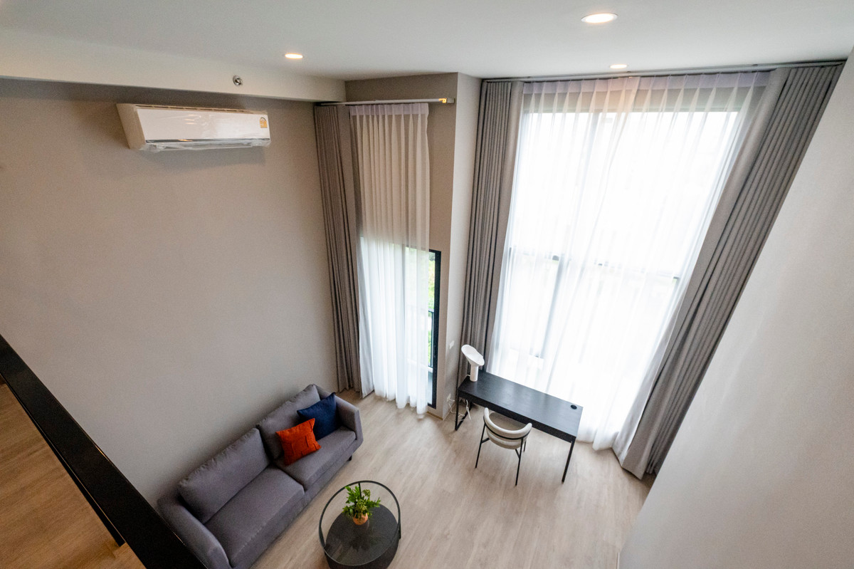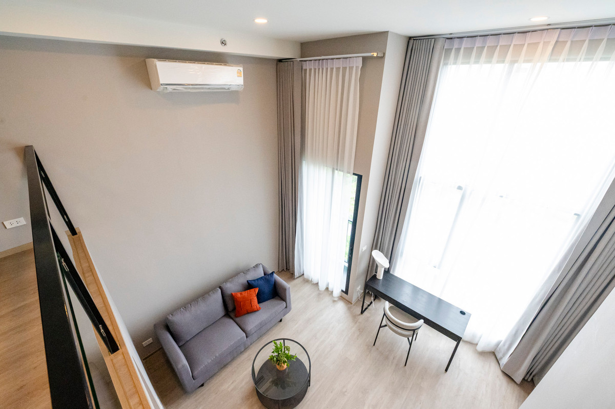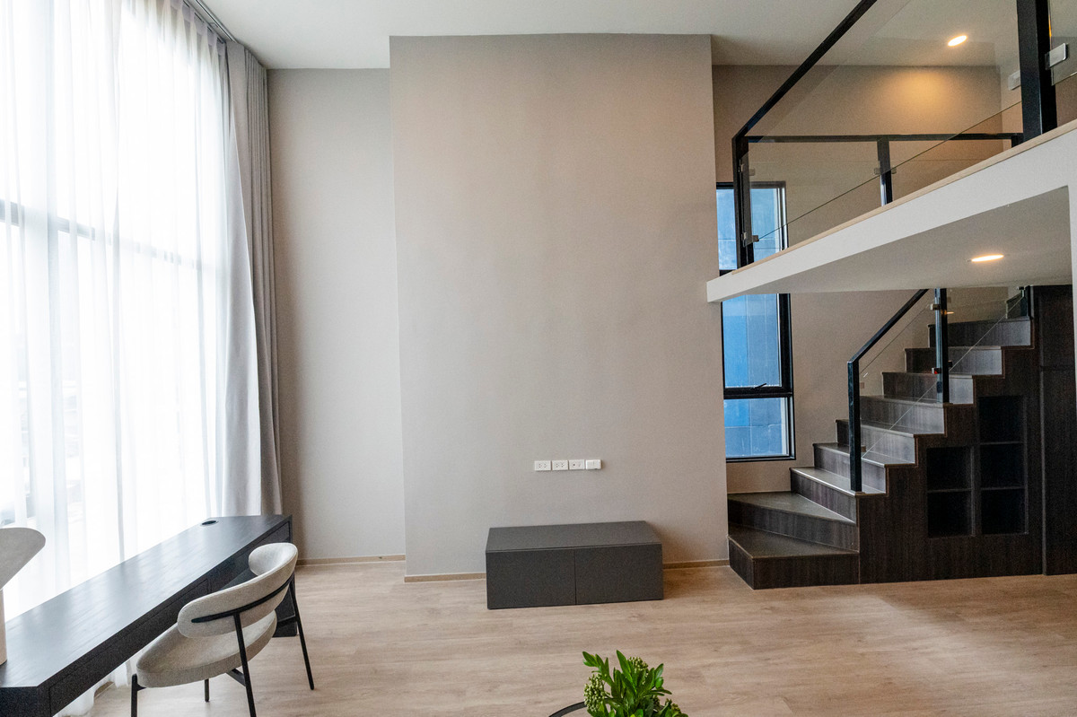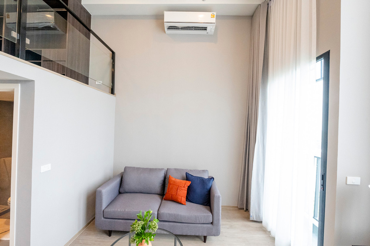 2-story room, ceiling height 4.2 meters! More functions than just a residence @Origin Plug & Play Ramindra* Experience a new way of living that feels like home! With a Duo Space design room that is perfectly proportioned ✨ Highlight that you must love: Double Volume: Extra high ceiling. Gives a feeling of airiness, openness, more comfort than a normal condo Multi-Purpose Area: The mezzanine is converted into a bedroom. Or a private office room in a chic style Smart Closet & Kitchen: Arrange usable space to make every square inch worth it This building allows pets: You will live alone with your cat. Or living as a couple is not uncomfortable Good location next to the main road, Ramindra, near Fashion Island and the Pink Line Can raise 2 dogs and cats.