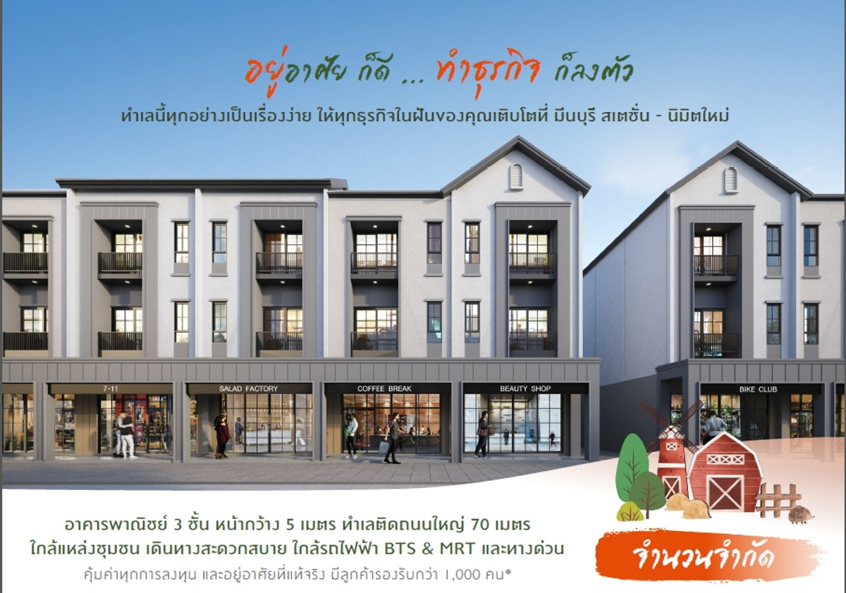 Commercial building for sale The Connect Minburi Station Nimitmai project, last lot, only a few houses left. Location next to Nimitmai main road, suitable for business, office use, or residence. Guaranteed customers in the village with more than 300 units and this location already has a village with residents. More than a thousand units 3-story commercial building, usable area 169 square meters, land 24 square meters. Parking for 2 cars in front of the building, 3 floors, 3 bathrooms. install water pump The water tank is complete. There is a back of the house to support cooking. Buy to run your own business or invest, keep and rent out, it's worth it. Special price 5.99 million** With free transfer fees and mortgage fees Free installation fee for water and electricity meters (ready to provide) If interested, contact Contact number (Mint)