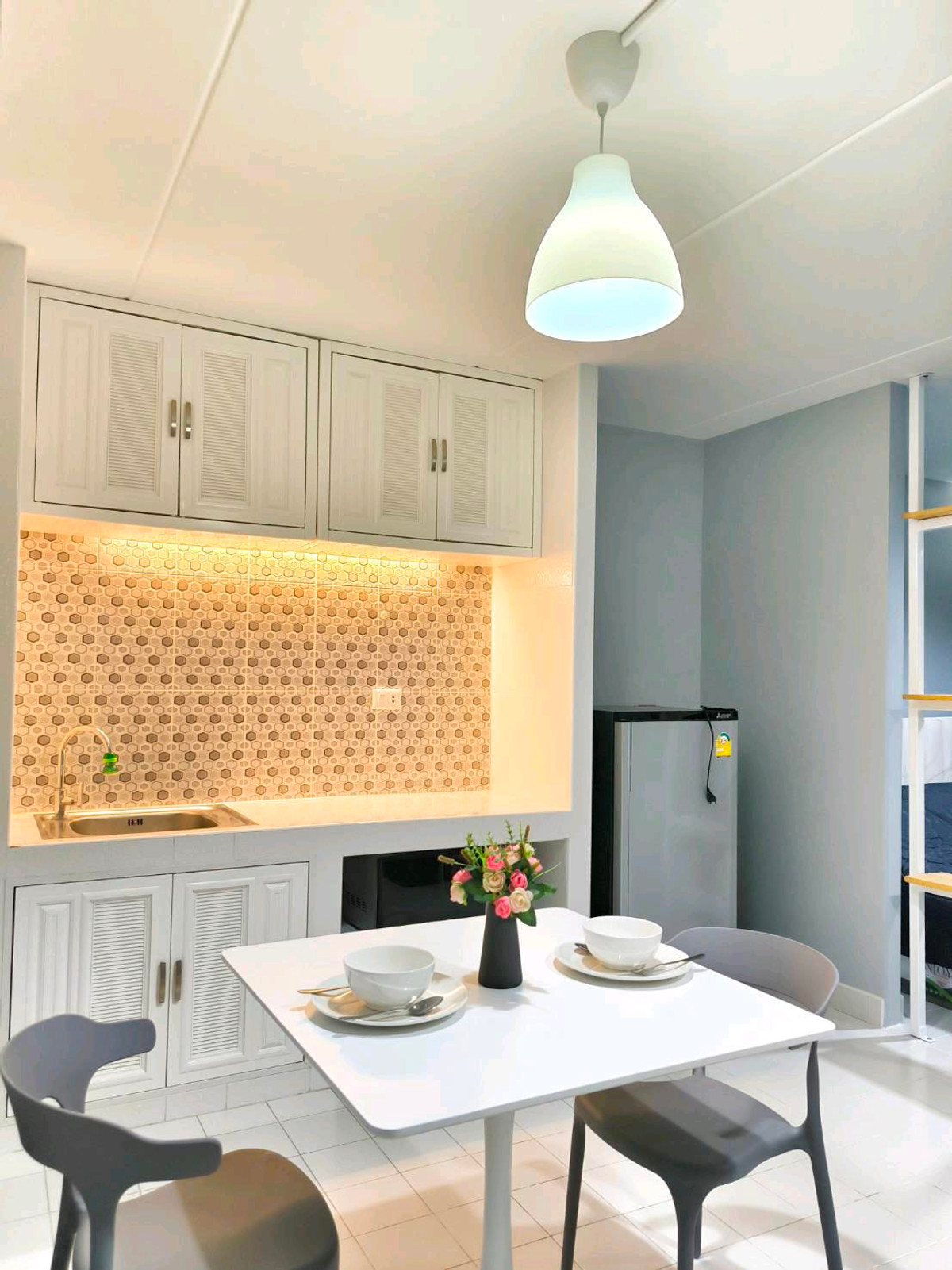 The room has been renovated and is stunningly beautiful. The rental rate does not include common areas. Central area starts at 550 baht for a water unit and 20 baht for a royal electric rate.