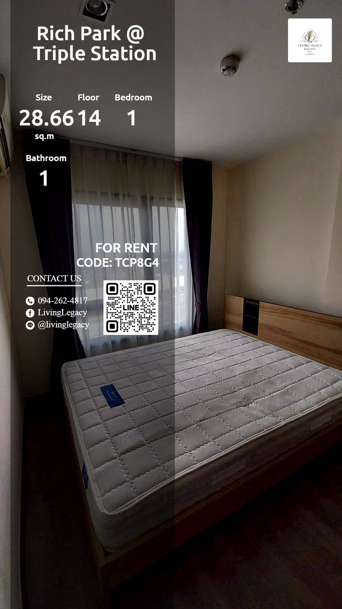 🏠 TCP8G4 Condo for rent Rich Park @ Triple Station 28.66 sq m, 14th floor, 1 bedroom, 1 bathroom ✨ Ready to move in immediately! Beautiful room, fully decorated Ready to move in! 🔍Details - Number of bedrooms: 1 - Number of bathrooms: 1 - Usable area (sq m): 28.66 - Floor: 14 🌟 Highlight this room! 🌟 🌟Various amenities - Air conditioning - Furniture 📞 Hurry and reserve now! Ask for more details Price 10000 baht Property code: TCP8G4 If interested, contact Add Line ID: @livinglegacy Facebook: LivingLegacy WhatsApp: https://wa.me/ Contact number Interested in other rooms in the project, click: https://living-legacy.atrobot.asia/property-listing/65b21ad1bcd44ce4d4091697 #RichParkTripleStation #EscoT haiCompanyLimited #CLOVERPOWERPUBLICCOMPANYLIMITED #NgammanaSchool #YamahaMusicSchoolTheNineYam Music School HahaThe Nine #MarukaMachineryThailandCoLtdHEADOFFICE #MinderPathanaSuksaSchool #WMTA Applied Thai Traditional Medicine Clinic #BeaconhouseYamsaardInternationalSchool #Bangkapi #SamitivejInternationalChildrensHospital