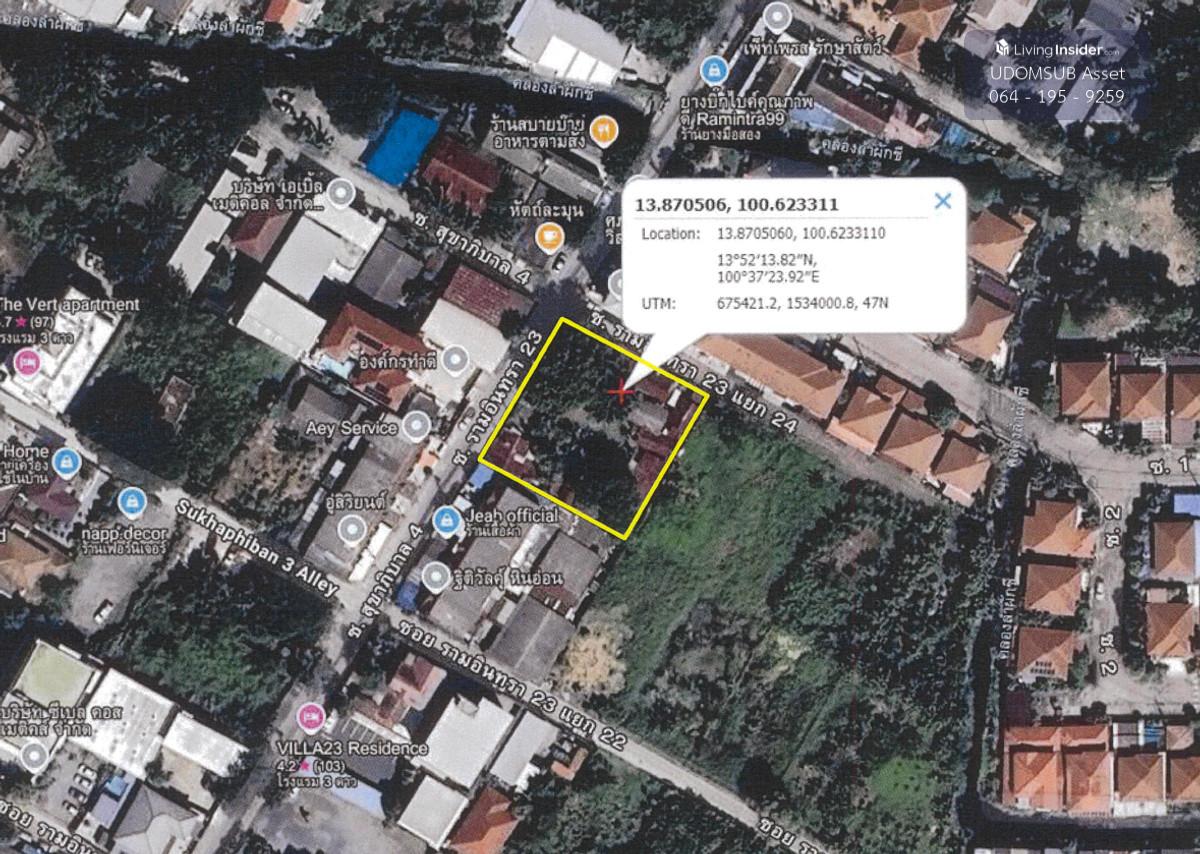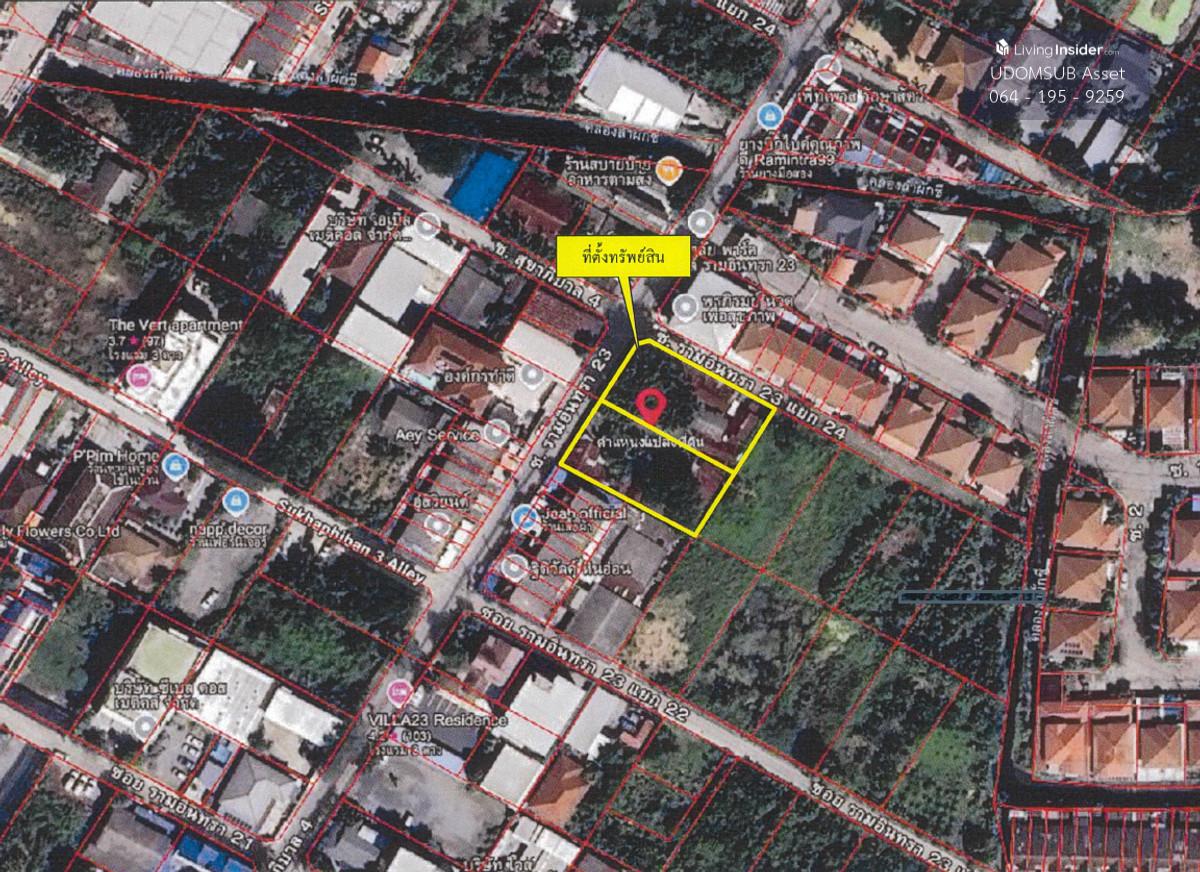 Land for sale 399 sq m., Soi Ramintra 23, corner plot, next to the road on 2 sides, near BTS Lat Pla Khao 1 km.