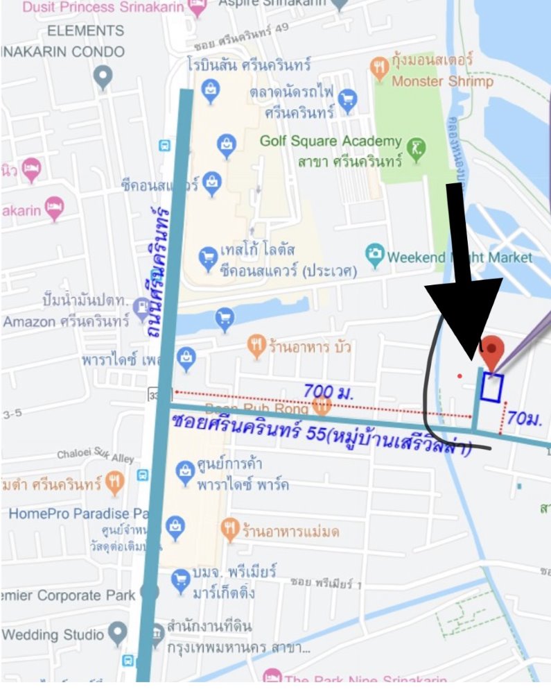 Land for sale in Seri Villa Srinakarin Road Soi Paradise Shopping Center From Soi Srinakarin 55, enter 700 meters, including 2 deed, total area 1-2-00 rai (600 square), size 43 x 56.6 meters, Bang Bon