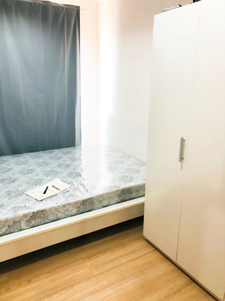 • The bedroom has a 5-foot bed with a large wardrobe (3 doors) • There is a partition for the kitchen. Can place the refrigerator make the living area open There is a lot of space