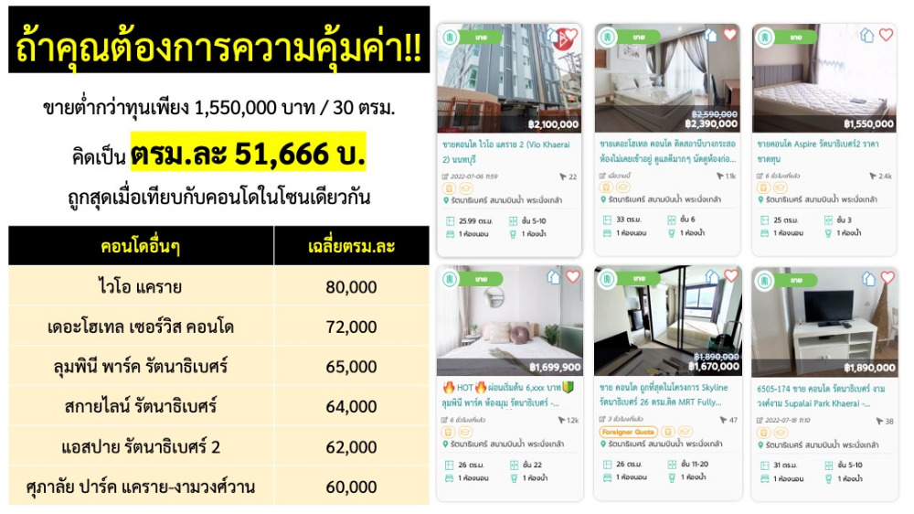 • Cheapest compared to second-hand condos in the same zone which fall at 60,000 baht per sq m., Vio Khae Rai, an average of 80,000 baht per sq m.
