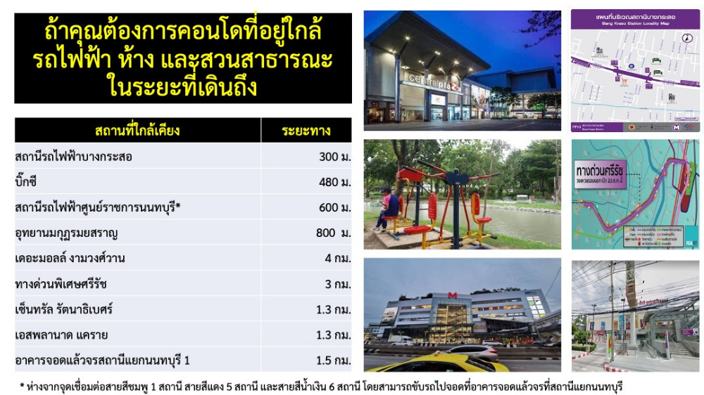 • If traveling by the Purple Line, you can walk to Bang Krasor Station, 300 meters away, or you can walk to the Pink Line at Nonthaburi Government Center Station, 600 meters away.