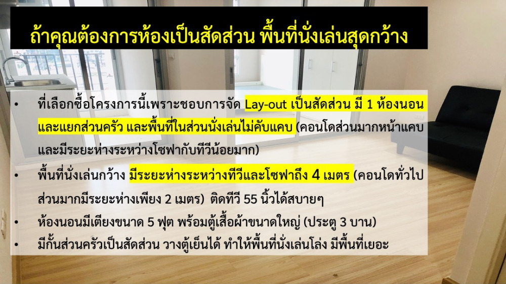 • I choose to buy this project because I like the layout of the layout, having 1 bedroom and separating the kitchen. and the space in the living area is not cramped (Most condos have a narrow front and there is very little distance between the sofa and the TV.)