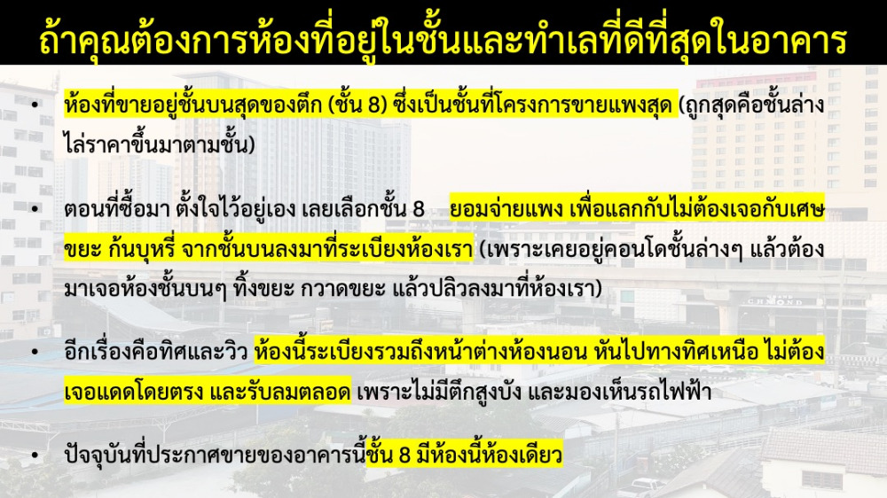 • The room for sale is on the top floor of the building (8th floor), which is the floor that the project sells for the most expensive. (The cheapest is the lower floor, chasing the price up by floor)