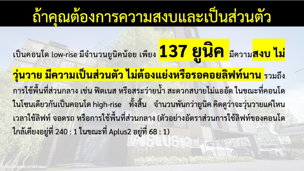• For example, the elevator utilization ratio of nearby condos (Aspire Rattanathibet 2) is at 240 : 1 while Aplus2 is at 68 : 1).