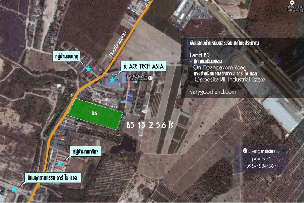 For sale: Rayong land. Beautiful plot, good location, on Noen Phayom Road, near RIL Industrial Estate. Land plot B5, title deed 15-2-5.6 rai, beautiful land plot on Noen Phayom Road, near RIL Industri