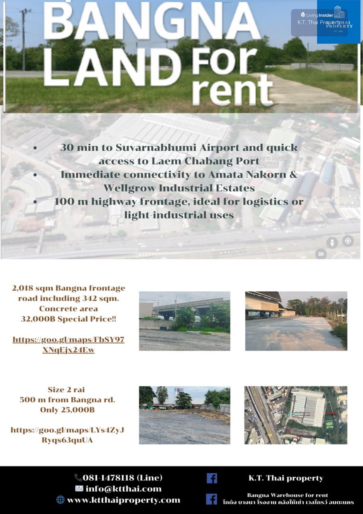 Land for Rent near Bangkok International Airport | Bangna-Trad KM. 42 [NOW RENTED - FRONT AREA ALREADY FILLED] Rear Land Plot Still Available! • Approx. 2 Rai (3,200 sqm) • Special Price: 21,000 THB/month • Ideal for drive-through businesses, storage yards, or commercial use Location Highlights: • Bangna-Trad Road KM. 42 • Close to Welgrow and Amata City Industrial Estates • Near Laem Chabang Port • Easy access to expressways and EEC zone Warehouse for Rent Also Available: • Sizes from 460 - 3,000 sqm • Suitable for storage, logistics, and light manufacturing • Prime location with wide roads for container access Coordinates: [13.5435320, 100.9624273] https://maps.app.goo.gl/DkciXfcjNEMNh96f6?g_st=ic Contact Us: Pear: Contact number Email: Contact email WeChat: natreektthai WhatsApp: Contact number Line Official: @natree Facebook: @K.T. Thai Property More Info: Website: www.ktthai.com/warehouse www.ktthaiproperty.com Video Tour: Watch on YouTube Pinterest: KT Thai Property LinkedIn: K.T. Thai Local Product Co., Ltd Keywords: #BangnaWarehouse #WarehouseForRent #FactoryForRent #RentalWarehouse #BangnaTrad #EEC #Chachoengsao #StorageSpace #IndustrialEstate #WarehouseNearPort #SMEFactory #LogisticsThailan