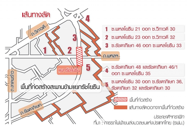 ทั้งนี้ เพื่อเป็นการบรรเทาปัญหาผู้ว่าการ รฟม.ระบุว่า มีเส้นทางเลี่ยง 5 เส้นทาง 1.เข้าซอยพหลโยธิน 21 ออกไปยังซอยวิภาวดี 30 2.เข้าซอยพหลโยธิน 23 ออกไปยังซอยวิภาวดี 32 3.เข้าซอยรัชดาภิเษก 46 ออกไปยังซอยพหลโยธิน 33 4.เข้าซอยรัชดาภิเษก 48 และ 46/1 ออกไปยังซอยพหลโยธิน 35 และ 5. เข้าซอยพหลโยธิน 30 ออกไปยังซอยรัชดาภิเษก 36, 32, 30