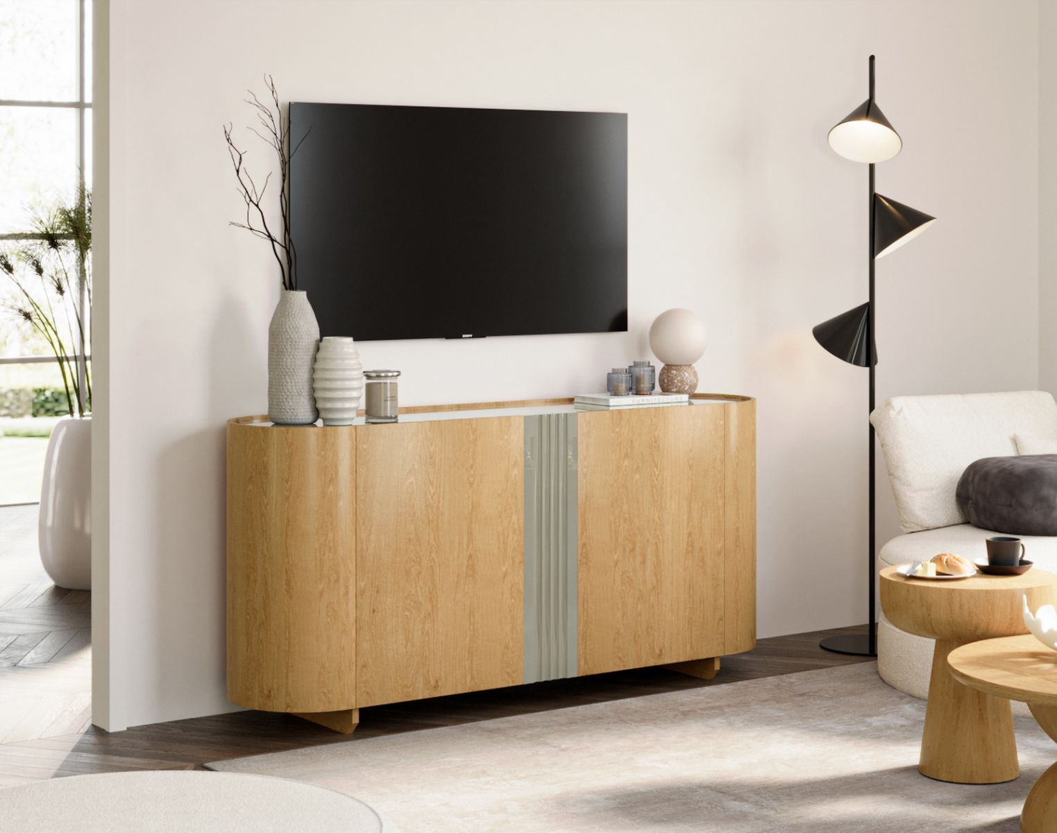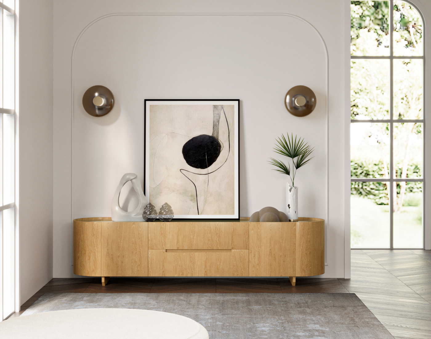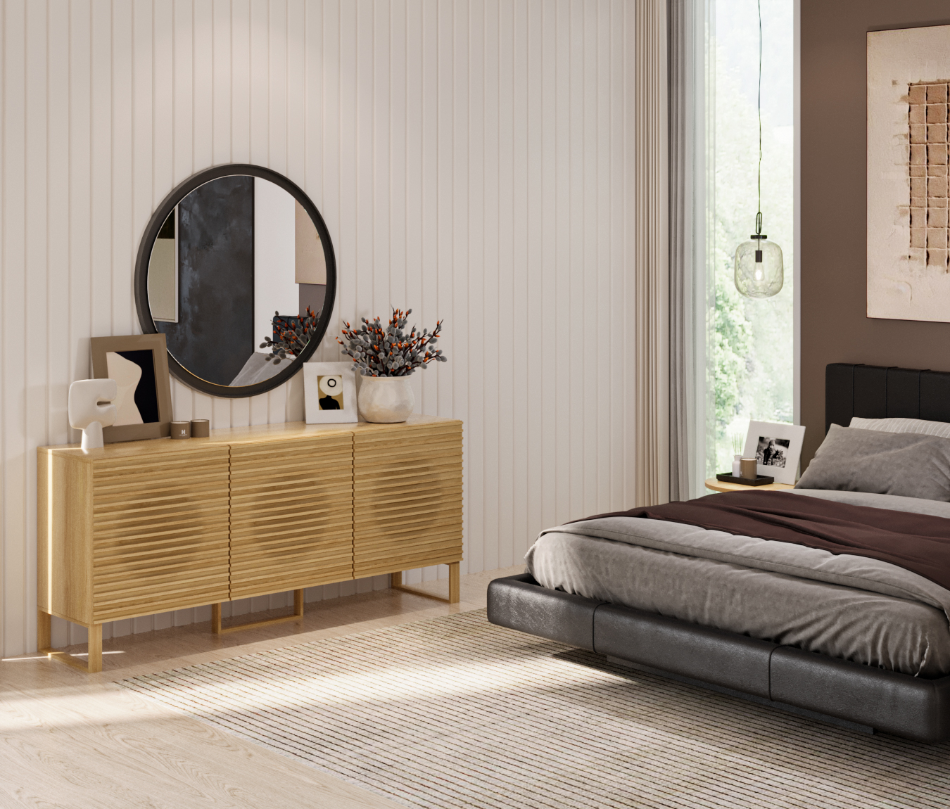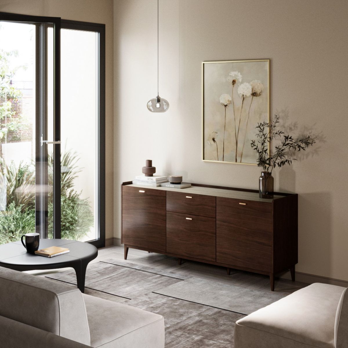 และ Westina Collection หรูหราอย่างสุขุม ด้วยการผสมผสานไม้ Veneer Oak สี Walnut เข้ากับหิน Travertine สีเบจอ่อน และดีไซน์เส้นสายแบบ Mid-Century Modern ตกแต่งด้วยดีเทลสีทองเล็ก ๆ สร้างความเรียบหรูที่ทรงพลัง