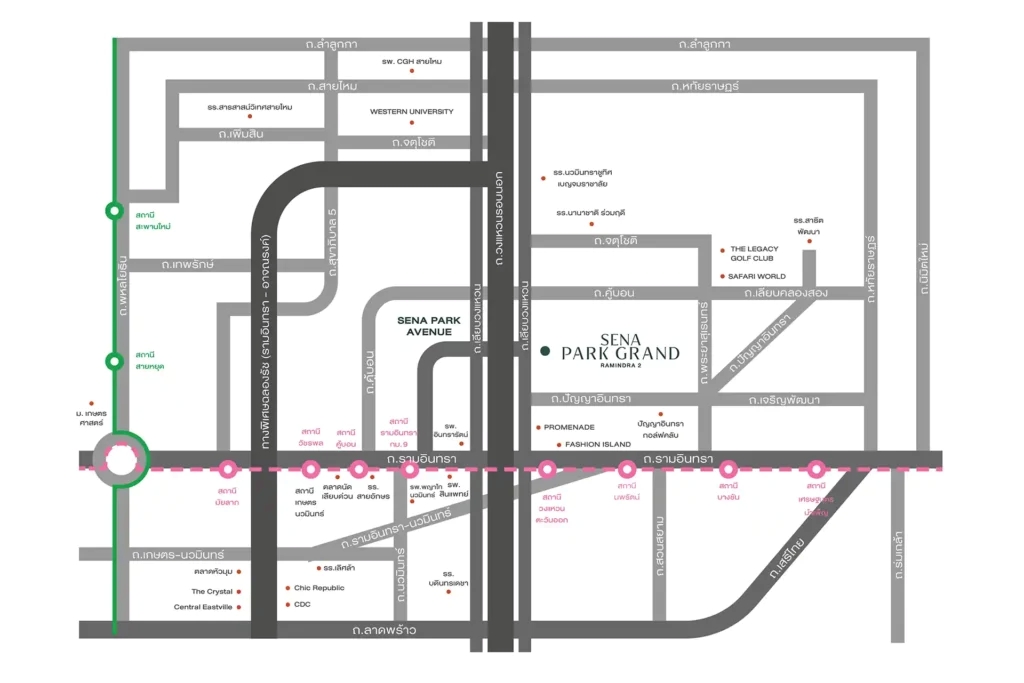 นอกจากนวัตกรรมด้านพลังงาน โครงการยังโดดเด่นด้วยทำเลศักยภาพสูงสุดของย่านรามอินทรา เดินทางเข้า-ออกได้หลายเส้นทาง เชื่อมต่อทั้งรถไฟฟ้าสายสีชมพู สถานีรามอินทรา กม.9 และทางด่วนหลัก รายล้อมด้วย Green District ขนาดใหญ่ เชื่อมต่อจากถนนใหญ่ผ่าน สวน SENA Park Avenue และคอมมิวนิตีสีเขียวของ SENA Park Residences ซึ่งมอบทั้งบรรยากาศร่มรื่นและสิ่งอำนวยความสะดวกเพื่อคุณภาพชีวิตของผู้อยู่อาศัย