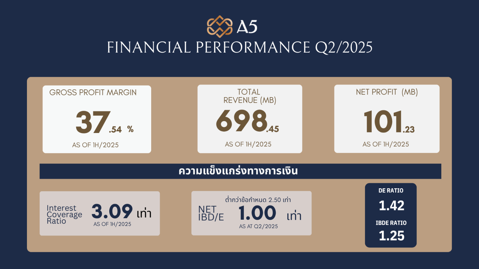 สำหรับผลประกอบการครึ่งปีแรก 2568 บริษัทมีรายได้รวม 698.45 ล้านบาท และมีกำไรสุทธิ 101.23 ล้านบาท อัตรากำไรขั้นต้นอยู่ที่ 37.54% สะท้อนถึงประสิทธิภาพการบริหารต้นทุนและความแข็งแกร่งของดีมานด์ในตลาดบ้านหรู ขณะที่ Interest Coverage Ratio อยู่ที่ 3.09 เท่า สูงกว่าข้อกำหนดขั้นต่ำ 2.50 เท่า แสดงถึงฐานะทางการเงินที่มั่นคง โดยมี Net IBD/E 1.00 เท่า และ DE Ratio 1.42 เท่า ซึ่งอยู่ในระดับปลอดภัยต่อการเติบโตระยะยาว