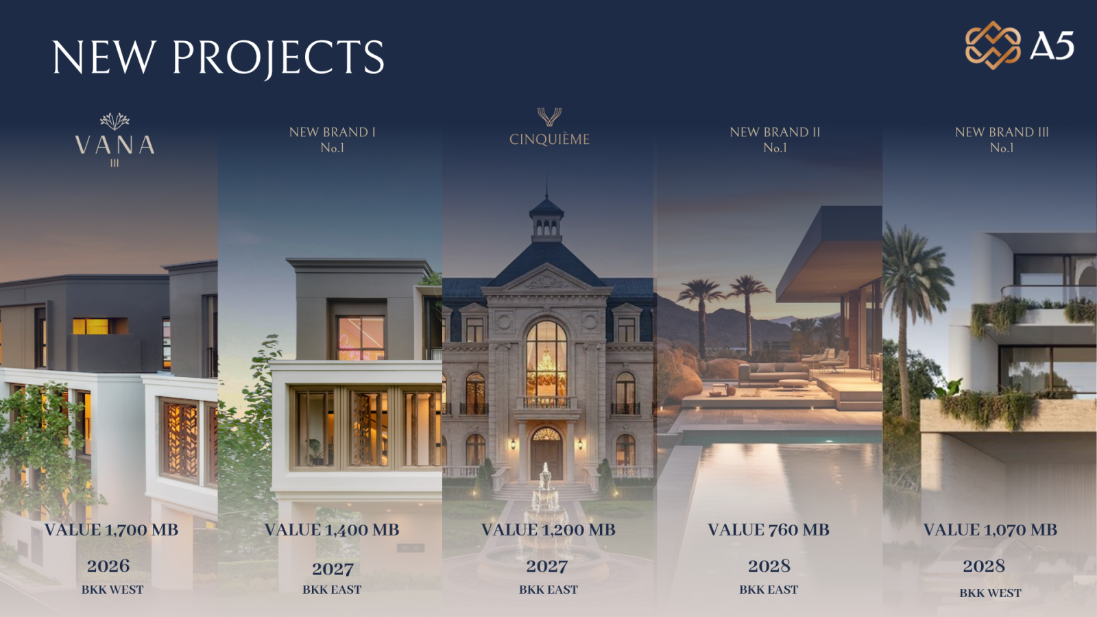 ที่ผ่านมา A5 สร้างผลงานเด่นอย่างต่อเนื่อง ไม่ว่าจะเป็น Cinq Royal Krungthep Kreetha มูลค่า 3,500 ล้านบาท ที่ขายหมดและโอนกรรมสิทธิ์ครบทุกยูนิตภายในเวลาเพียง 2 ปี 9 เดือน สะท้อนความเชื่อมั่นในแบรนด์ รวมถึงโครงการ VANA Ratchapruek–Westville และ Cinq Royal The Eighteen Bangna KM.7 ที่ได้รับการตอบรับอย่างดีจากตลาด