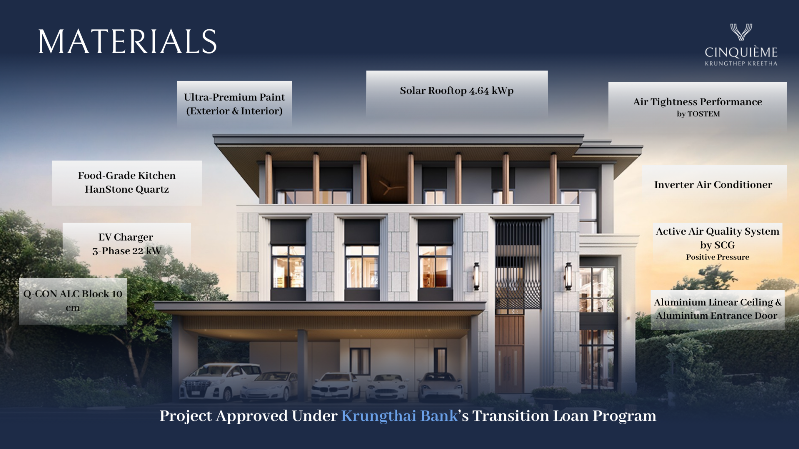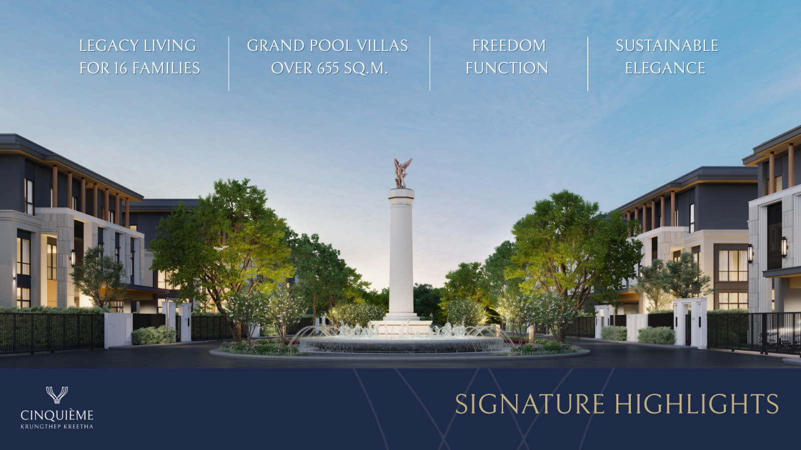 โครงการ Cinquième Krungthep Kreetha (แซงเคียม กรุงเทพกรีฑา) มีความเอ็กซ์คลูซีฟสูงสุด ด้วยจำนวนเพียง 16 ยูนิต แต่ละหลังออกแบบเป็น Grand Pool Villa ขนาดใหญ่พร้อมลิฟต์ส่วนตัว พื้นที่ใช้สอยตั้งแต่ 655–805 ตารางเมตร เชื่อมโยงพื้นที่ Indoor และ Outdoor อย่างลงตัว ตลอดจนเลือกใช้วัสดุเกรดพรีเมียมจากแบรนด์ชั้นนำระดับโลก อาทิ Gessi, Kohler, TOTO
