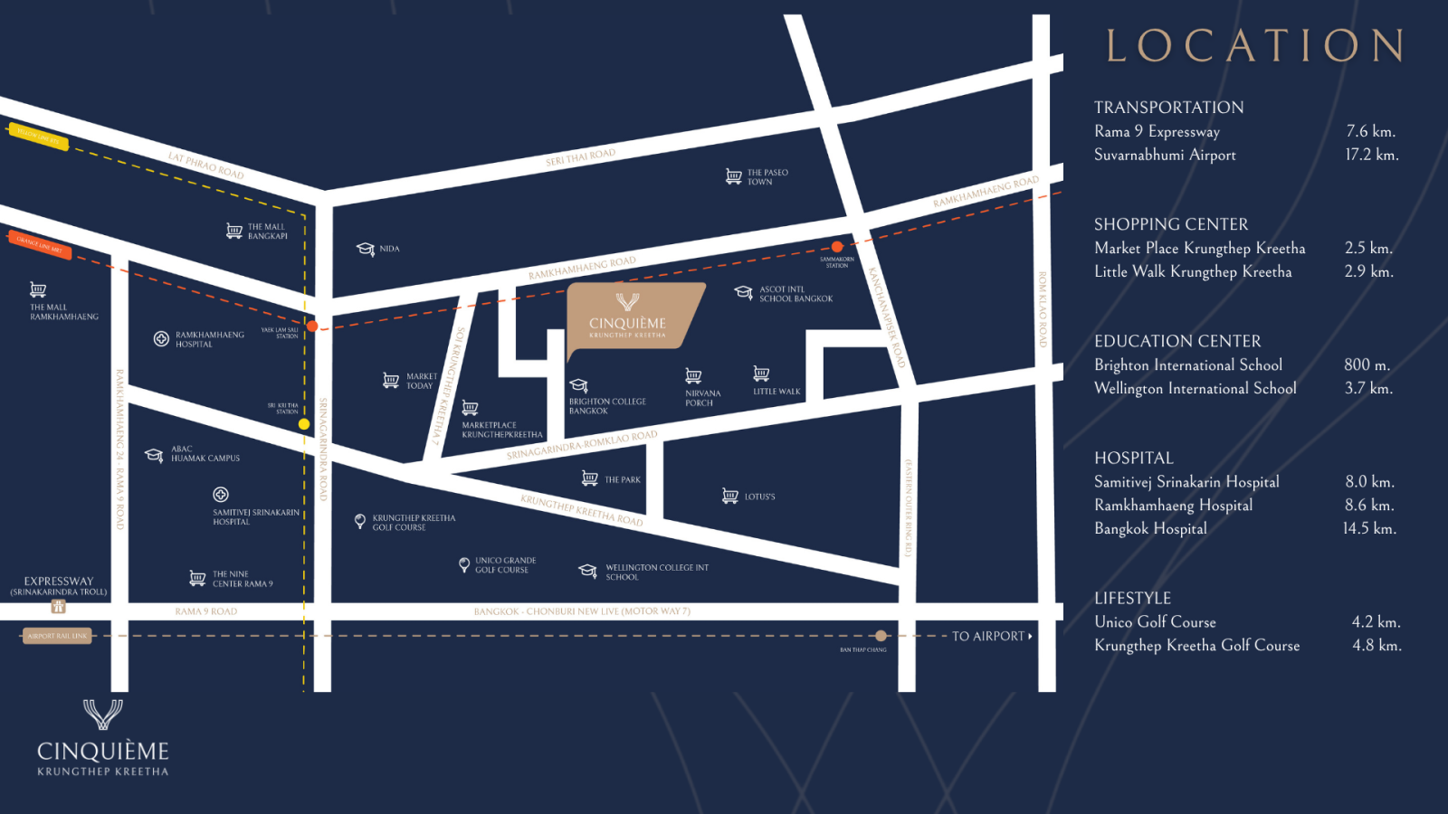 ตั้งอยู่บนทำเลศักยภาพ ย่านกรุงเทพกรีฑา ใกล้สถานศึกษาชั้นนำและสิ่งอำนวยความสะดวกครบครัน อาทิ Brighton College (800 ม.), Market Place กรุงเทพกรีฑา (2 กม.) และ สนามบินสุวรรณภูมิ (15 กม.)