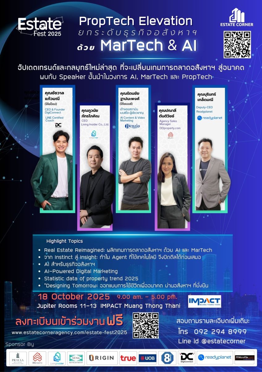 นายนริศร อุไรกิจ ประธานเจ้าหน้าที่บริหาร บริษัท เอสเตท คอร์นเนอร์ คอร์ปอเรชั่น จำกัด กล่าวว่า “ESTATE Festival 2025 ไม่เพียงเป็นงานแสดงอสังหาฯ แต่คือ เวทีแห่งโอกาส ที่เปิดให้ทุกคนได้เรียนรู้ สร้างเครือข่าย และลงทุนในอนาคตของวงการอสังหาริมทรัพย์ไทยและภูมิภาค งานนี้จะช่วยตอกย้ำภาพลักษณ์และความสามารถของอสังหาฯ ไทยสู่สายตานานาชาติ”