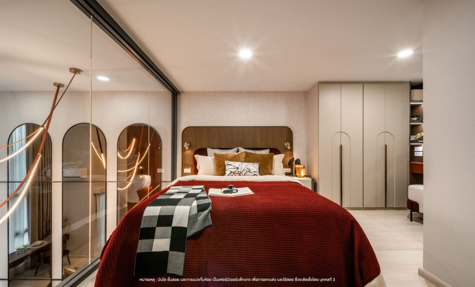 ในขณะที่ชั้นลอยคงความเป็น Master Bedroom ส่วนตัว ซึ่งยังคงมีห้องน้ำส่วนตัวบนชั้นลอย (Powder Room) เพิ่มความสะดวกสบายสูงสุด และยังสามารถใช้พื้นที่หน้าห้องนอนเป็นมุมพักผ่อนหรือมุมทำงานเล็ก ๆ ได้อีกด้วย