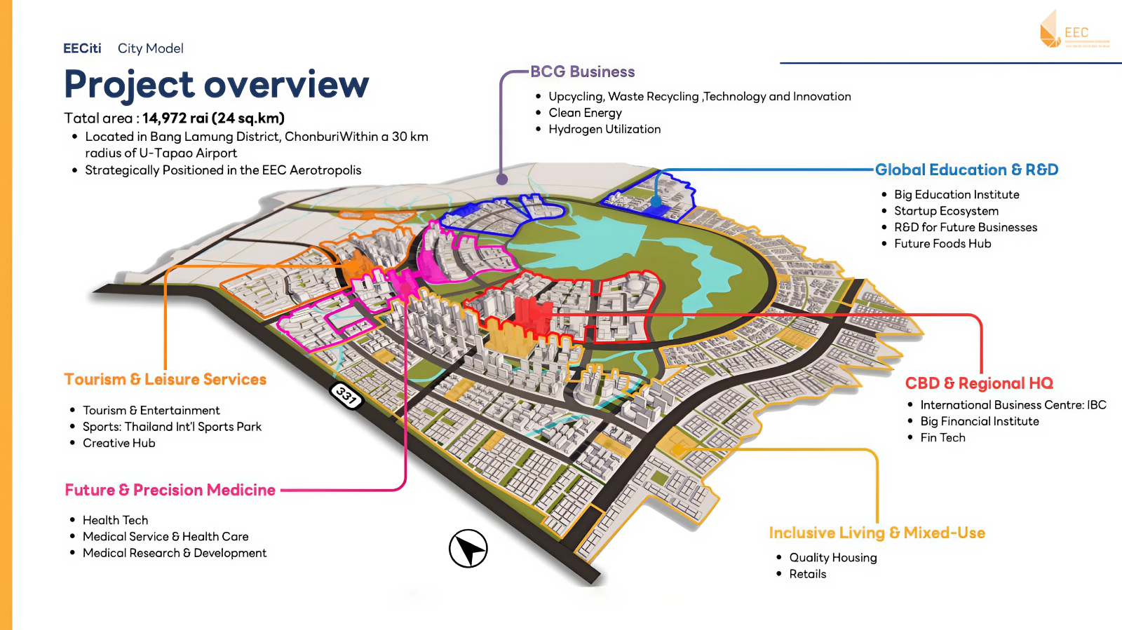 รวมถึงจะเป็นประโยชน์สำหรับประชากรปัจจุบันที่อาศัยอยู่ที่ตำบลห้วยใหญ่ อำเภอบางละมุง จังหวัดชลบุรี ซึ่งเป็นที่ตั้งของโครงการ สอดคล้องกับยุทธศาสตร์ชาติ และเป้าหมายการพัฒนาอย่างยั่งยืน หรือ SDGs รวมทั้งรับกับเทรนด์โลกและความต้องการของตลาด โดยแบ่งเป็น 6 โซนพื้นที่คลัสเตอร์ธุรกิจหลักภายในโครงการฯ ได้แก่