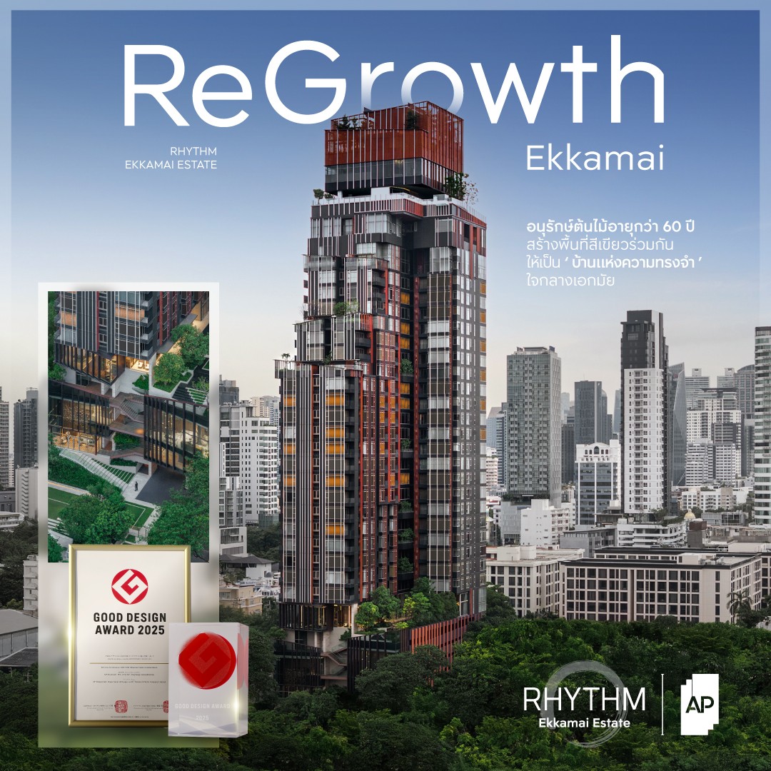 RHYTHM Ekkamai Estate - ReGrowth Ekkamai คว้ารางวัล GOOD DESIGN AWARD โครงการที่เริ่มต้นจากเจตนารมณ์ที่แน่วแน่ในการให้คุณค่ากับธรรมชาติเป็นอันดับแรก โดยเฉพาะการอนุรักษ์ต้นไม้เก่าแก่ขนาดใหญ่อายุกว่า 60 ปี ก่อนเริ่มงานดีไซน์ทั้งหมด สร้างโมเดลใหม่ของการพัฒนาอสังหาฯ ที่เน้นคุณค่าของธรรมชาติเป็นอันดับแรก นำมาสู่การสร้าง ‘พื้นที่สีเขียวร่วมกัน’ ที่ซึ่งเป็น ‘บ้านแห่งความทรงจำ’ ใจกลางเอกมัย สำหรับทั้งผู้อยู่อาศัยในโครงการ สังคมและธรรมชาติใจกลางเมืองใหญ่