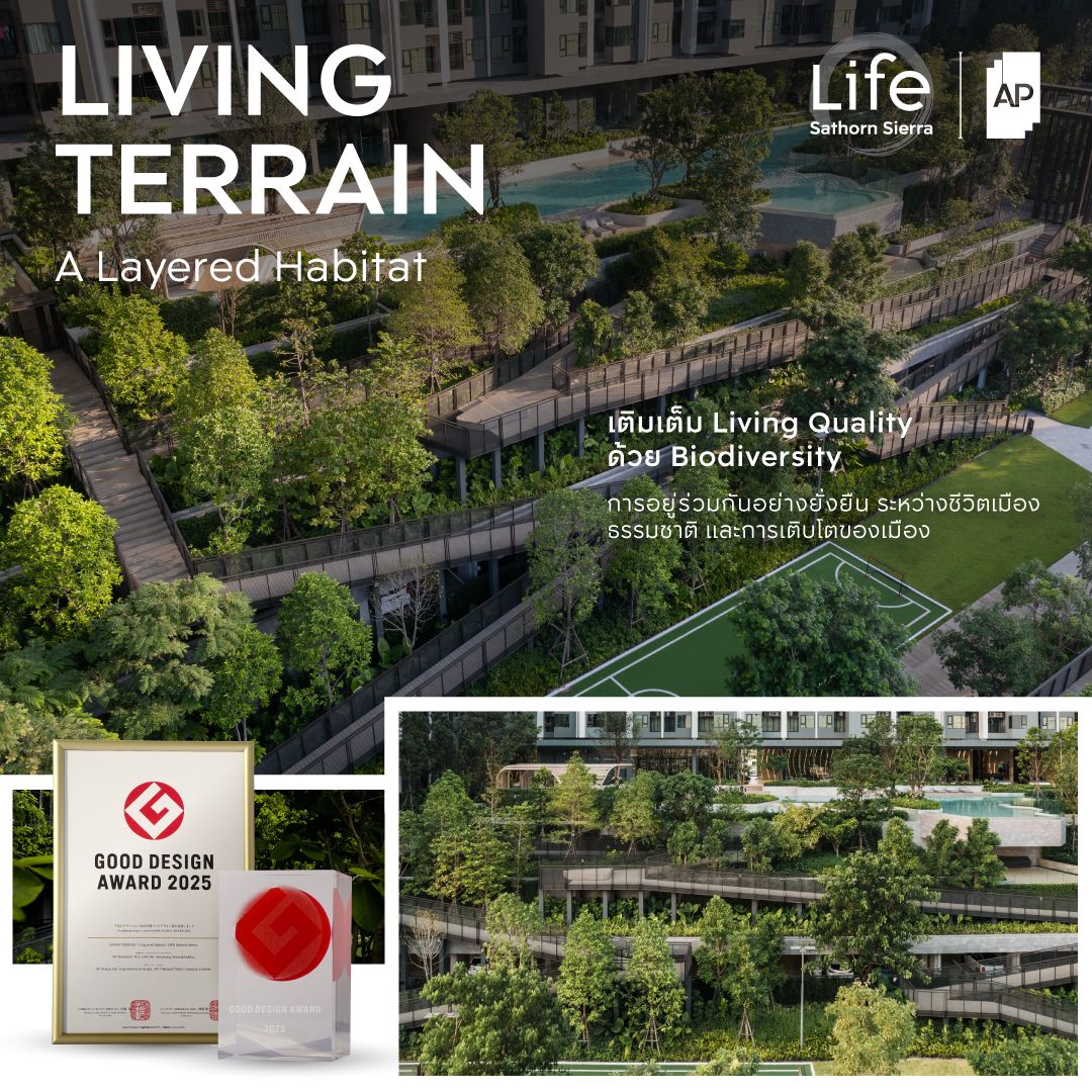LIFE Sathorn Sierra - LIVING TERRAIN: A Layered Habitat ก็คว้ารางวัล Good Design Award ด้วยความโดดเด่นจากการออกแบบพื้นที่ส่วนกลางในโครงการคอนโดมิเนียม ที่คำนึงถึงบริบทของธรรมชาติและการสร้างสภาพแวดล้อมที่เชื่อมโยงถึงกัน (Layered Habitat) เพื่อมอบประสบการณ์การอยู่อาศัยและคุณภาพชีวิตที่อุดมสมบูรณ์และเป็นมิตรต่อทั้งผู้อยู่อาศัยในโครงการ นก ผีเสื้อ แมลงต่างๆ ต้นไม้และเมือง