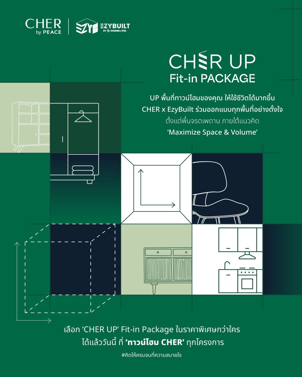 พีซแอนด์ลีฟวิ่ง เดินหน้ายกระดับมาตรฐานการดูแลลูกบ้าน จับมือ EZYBUILT by Q-CHANG (อีซี่บิวท์ บาย คิวช่าง) ผู้เชี่ยวชาญด้านการออกแบบและติดตั้งเฟอร์นิเจอร์ Fit-in ครบวงจร เปิดตัว Fit-in Package “CHER UP” UP พื้นที่ทาวน์โฮมให้ใช้ชีวิตได้มากขึ้น ออกแบบมาให้ “ครบ จบ สบายใจ” ช่วยเพิ่มพื้นที่และฟังก์ชันการใช้งานให้คุ้มค่า เพื่อให้บ้านเป็นระเบียบ ใช้สอยง่าย อยู่สบายยิ่งขึ้น และตอบโจทย์ไลฟ์สไตล์ของครอบครัวยุคใหม่