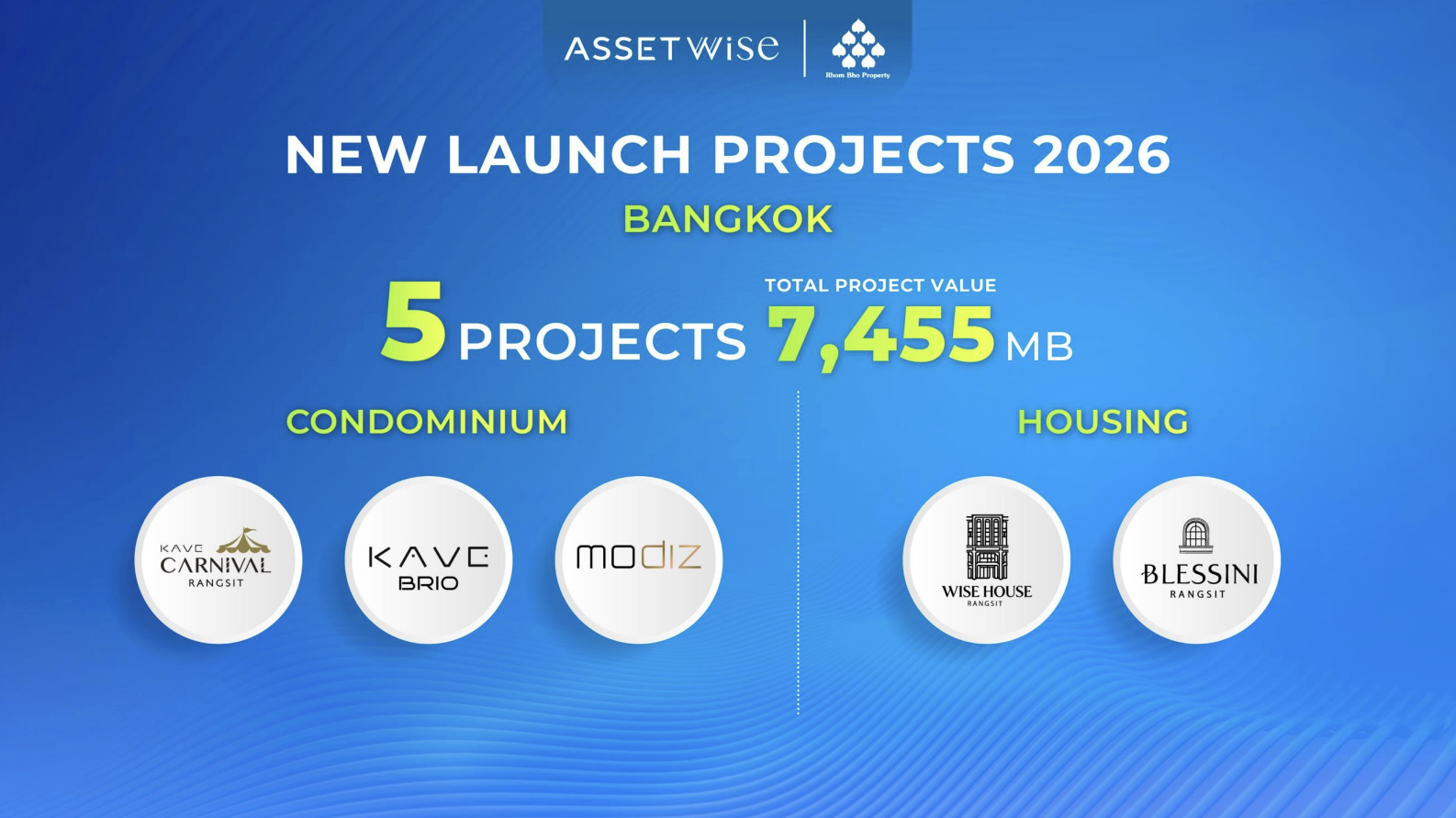 ทั้งนี้ แอสเซทไวส์มีแผนเปิดตัวโครงการใหม่จำนวน 11 โครงการ มูลค่ารวม 17,555 ล้านบาท แบ่งเป็นโครงการในกรุงเทพฯและปริมณฑล จำนวน 5 โครงการ มูลค่ารวม 7,455 ล้านบาท โดยในช่วงครึ่งปีแรกจะทยอยเปิดตัวโครงการคอนโดมิเนียม “เคฟ คานิเวิล รังสิต” (Kave Carnival Rangsit) รวมถึงโครงการแนวราบแบรนด์ใหม่ “เบลสซินี่ รังสิต” (Blessini Rangsit) บ้านเดี่ยว 2 ชั้น และโครงการช็อปเฮาส์ภายใต้แบรนด์ “ไวส์ เฮาส์ รังสิต” (Wise House Rangsit) บนทำเลใกล้มหาวิทยาลัยรังสิต