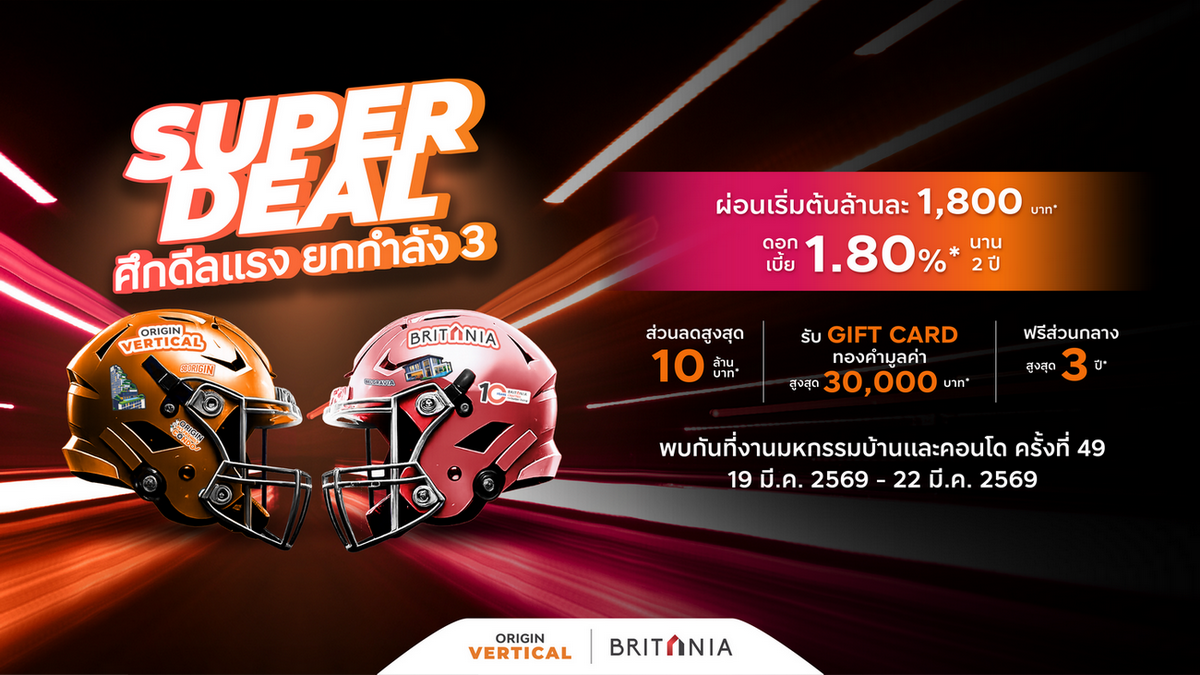ออริจิ้น เวอร์ติเคิล – บริทาเนีย แทคทีมเปิดสนาม แคมเปญ “Super Deal ศึกดีลแรง ยกกำลัง 3” คอนโด-บ้านอัดโปรแรง ลดสูงสุด 10 ล้านบาท* ปิดดีลรับโบนัส Gift Card ทองคำ มูลค่าสูงสุด 30,000 บาท* พร้อมจับมือพันธมิตรธนาคารชั้นนำ ปล่อยดอกเบี้ยพิเศษ! 1.80%* ผ่อนเริ่มต้นล้านละ 1,800 บาท* นาน 2 ปี* ดีลแรงแบบนี้ไม่ได้มีทุกเกม ใครช้า…อาจพลาดโปรที่ดีที่สุดของสนามนี้ พบกัน Game Day! ในงานมหกรรมบ้านและคอนโด ครั้งที่ 49 วันที่ 19-22 มีนาคม 2569 เท่านั้น