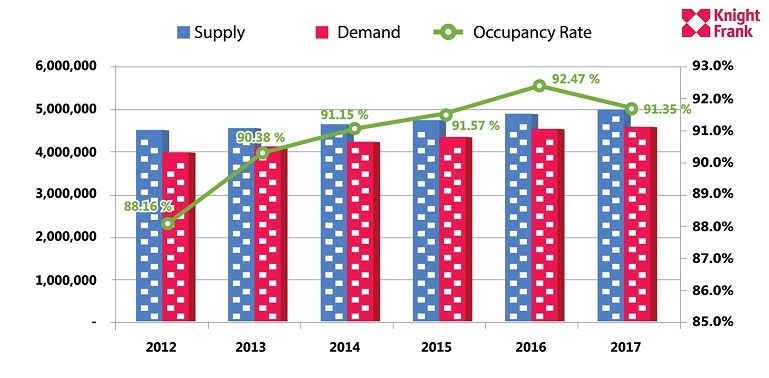 ในไตรมาสที่ 4 ปี 2560 พื้นที่ที่ถูกครอบครอง มีจำนวนรวมสุทธิอยู่ที่ 4,546,138 ตร.ม. แสดงอัตราการครอบครองโดยรวมอยู่ที่ร้อยละ 91.35 ซึ่งลดลงร้อยละ 1.1 ปีต่อปี แต่กรณีนี้ไม่ได้เกิดขึ้นตลอดทั้งปี