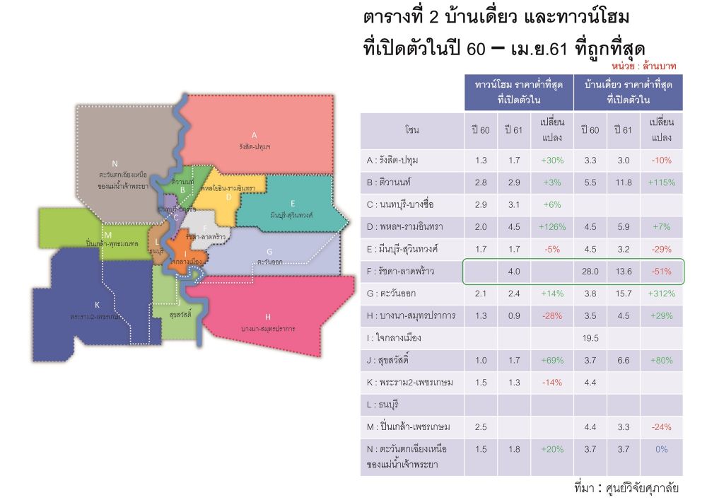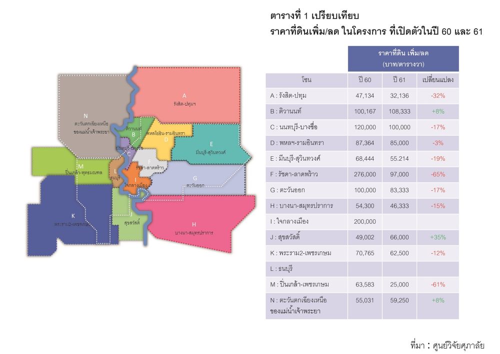 ตารางที่ 1 การเก็บตัวอย่างราคาที่ดิน 12 โซน ในกรุงเทพฯและปริมณฑลพบว่า ราคาที่ดินในกรุงเทพฯ ปี 2561 ลดลงจากปี 2560 โดยเฉลี่ย 15.8% ตัวเลขนี้ไม่ได้ชี้ว่าราคาที่ดินโดยทั่วไปในกรุงเทพฯและปริมณฑลลดลง แต่เป็นตัวชี้ว่า ที่ดินที่เปิดขายใหม่ห่างไกลจากตัวเมืองมากขึ้น ซึ่งเป็นสาเหตุที่ทำราคาที่ดินเปิดขายใหม่ลดลงราคาที่ดินเพียงอย่างเดียวไม่ได้เป็นตัวชี้ว่า สินค้าที่ดินพร้อมบ้านจะเป็นไปในทางทิศใด