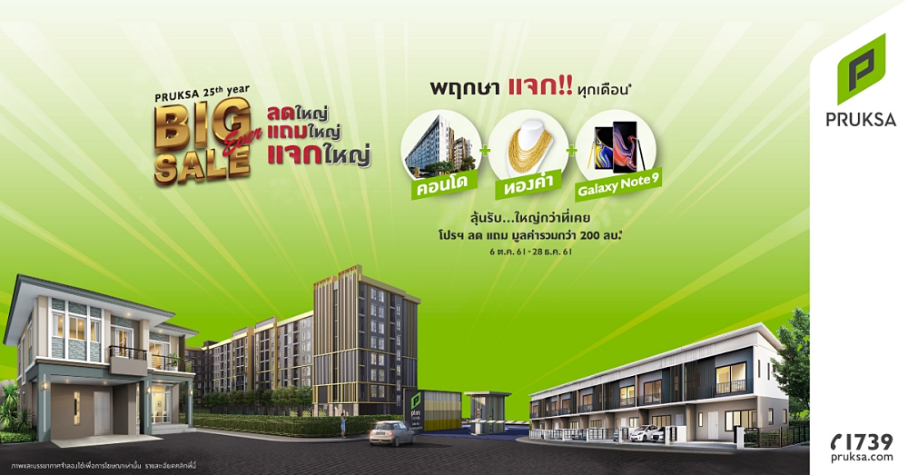 ด้วยความสำเร็จมาตลอด 25 ปี ในปีนี้พฤกษาจึงมามอบความสุขส่งท้ายปลายปีให้กับทุกคน ด้วยแคมเปญจัดหนัก “Big Sale Ever ลดใหญ่ แถมใหญ่ แจกใหญ่” ยกทัพทาวน์โฮม บ้านเดี่ยว คอนโด พร้อมเข้าอยู่ 161 โครงการ เพียงทำสัญญาและโอนภายในวันที่ 28 ธันวาคม 2561 เท่านี้ก็ลุ้นรับรางวัลถึง 2 ต่อด้วยกัน บอกคำเดียวว่าโปรแรงๆแบบนี้ ใครกำลังหาบ้าน ห้ามพลาดด้วยประการทั้งปวง