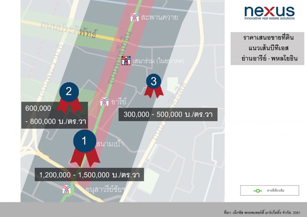 ซึ่งสามารถแบ่งได้เป็น 3 ช่วงราคา ดังนี้ 1. ตั้งแต่สถานีบีทีเอสอนุสาวรีย์ฯจนถึงอารีย์ราคาเสนอขายที่ดินอยู่ที่ตารางวาละ 1,200,000 – 1,500,000 บาท ซึ่งเป็นช่วงที่มีราคาเสนอขายสูงสุด 2. เส้นพหลโยธินซอยย่อยฝั่งเลขคี่ ราคาอยู่ที่ตารางวาละ 600,000 – 800,000 บาท และ 3. เส้นพหลโยธินซอยย่อยฝั่งเลขคู่ ราคาอยู่ที่ตารางวาละ 300,000 – 500,000 บาท ซึ่งเป็นทำเลที่มีราคาต่ำสุดเมื่อเปรียบเทียบกับทำเลอื่นในย่านนี้