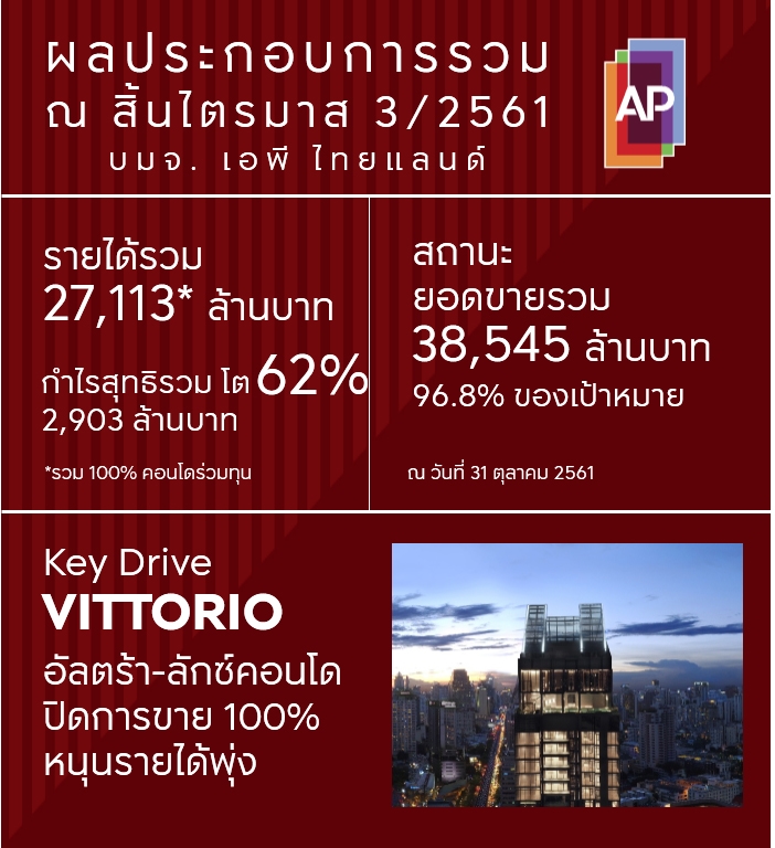 เอพีประกาศความสำเร็จรายได้รวม ณ สิ้นไตรมาส 3 ปี 2561 พุ่งขึ้นสูงสุดเป็นประวัติการณ์กว่า 27,110 ล้านบาท ผลจากการที่สินค้าแนวราบและคอนโดโตต่อเนื่องชูไฮไลต์เด็ดประจำไตรมาส VITTORIO อัลตร้า-ลักซ์คอนโดมิเนียม คีย์ไดรฟ์สำคัญหนุนรายได้พุ่งหลังปิดการขายทั้งโครงการ ด้านกำไรสุทธิรวม โตขึ้น 62% หรือกว่า 2,900 ล้านบาท ยอดขายรวม 10 เดือนคิดเป็น 38,540 ล้านบาท โค้งสุดท้ายของปีเดินหน้าเปิดโครงการใหม่ต่อเนื่อง มั่นใจสิ้นปีเตรียมยิ้มรับยอดขายที่คาดว่าจะทะลุเป้าอีกครั้ง