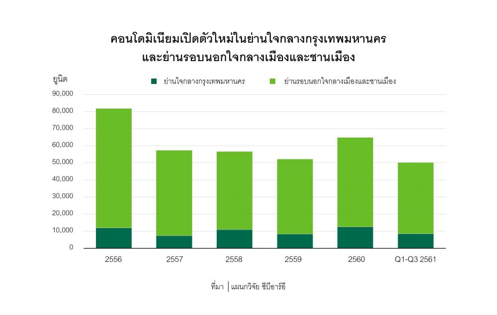 จากการสำรวจโดยแผนกวิจัย ซีบีอาร์อี พบว่า ณ ไตรมาสที่ 3 ปี 2561 มีการเปิดตัวคอนโดมิเนียมใหม่ในย่านใจกลางเมืองราว 7,200 ยูนิต เปรียบเทียบกับในช่วงสองไตรมาสแรกของปีนี้รวมกันมีเพียง 1,300 ยูนิต โดยคอนโดมิเนียมใหม่ที่เปิดตัวในย่านใจกลางกรุงเทพฯ ในช่วง 3 ไตรมาสแรกของปีนี้เพิ่มขึ้น 8% เมื่อเทียบกับช่วงเวลาเดียวกันในปีที่แล้ว
