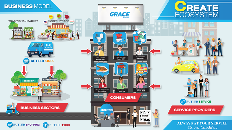 ทั้งนี้ BUTLER เป็นแอปพลิเคชันและแพลทฟอร์มด้านการจัดการชุมชนและสังคม (Community Management Platform) ที่รวบรวมทุกงานบริการเอาไว้อย่างครบวงจร เช่น บริการแม่บ้าน บริการดูแลรักษาบ้าน บริการซักอบรีด ผ่านการรวบรวมและร่วมมือกับบริการจากหลากหลายพันธมิตรไว้ในแอปเดียว อาทิ Seekster, Fixzy, Helpdee, Betagro, JP Insurance
