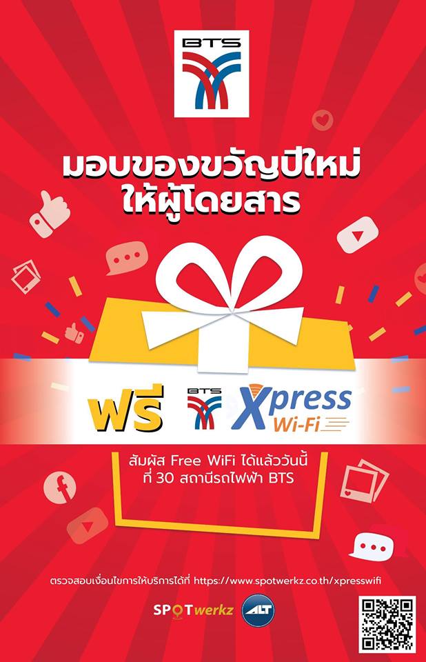 นายสุรพงษ์ กล่าวเพิ่มเติมว่า บริษัทฯ ได้มอบของขวัญปีใหม่ 2562 โดยบริษัทฯ ร่วมกับ บมจ. เอแอลที เทเลคอม (ALT) ติดตั้ง WIFI BTS Xpress เพื่อให้บริการฟรีอินเทอร์เน็ตไร้สาย (Free Wi-Fi) แก่ผู้ใช้บริการทุกพื้นที่บนสถานีรถไฟฟ้าบีทีเอส 30 สถานี ยกเว้น ส่วนต่อขยายสายสุขุมวิท ช่วงสถานีสำโรง – สถานีเคหะฯ และส่วนต่อขยายสายสีลม ช่วงสถานีวงเวียนไหญ่ – สถานีบางหว้า เพื่อมอบเป็นของขวัญให้แก่ผู้โดยสารถไฟฟ้าบีทีเอส ส่งท้ายปีเก่าต้อนรับปีใหม่ 2562