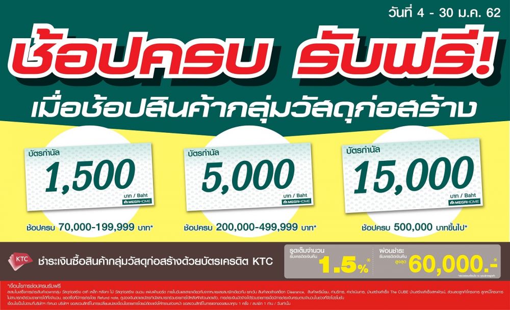 - สำหรับโปรโมชั่นรอบวันที่ 4-30 มกราคม 2562 ช้อปครบ 70,000 – 199,999 บาท รับบัตรกำนัล 1,500 บาท, ช้อปครบ 200,000 - 499,999 บาท รับบัตรกำนัล 5,000 บาท, ช้อปครบ 500,000 บาท รับบัตรกำนัล 15,000 บาท