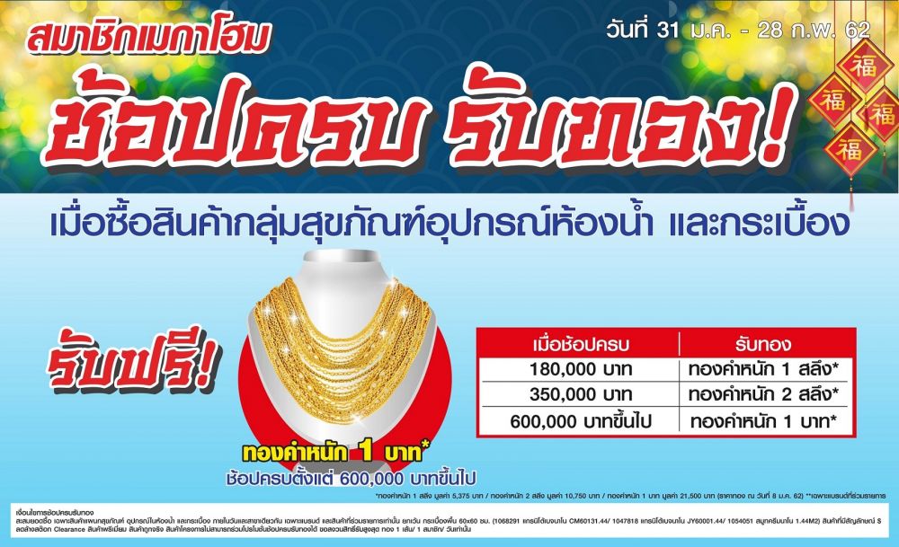 สุดพิเศษสมาชิกเมกาโฮม เมื่อลูกค้าซื้อสินค้ากลุ่มสุขภัณฑ์ห้องน้ำ และกระเบื้อง รับฟรี ทองคำหนัก 1 สลึง, ช้อปครบ 180,000 บาท รับฟรีทองคำหนัก 2 สลึง, ช้อปครบ 350,000 บาท รับทองคำหนัก 1 บาท, ช้อปครบตั้งแต่ 6 แสนบาทขึ้นไป ลูกค้าสามารถเลือกซื้อสินค้าในรายการส่งเสริมการขาย พร้อมรับโปรเด็ดโดนใจได้ ตั้งแต่วันนี้ - 28 กุมภาพันธ์ นี้ ที่เมกาโฮมสาขาใกล้บ้าน