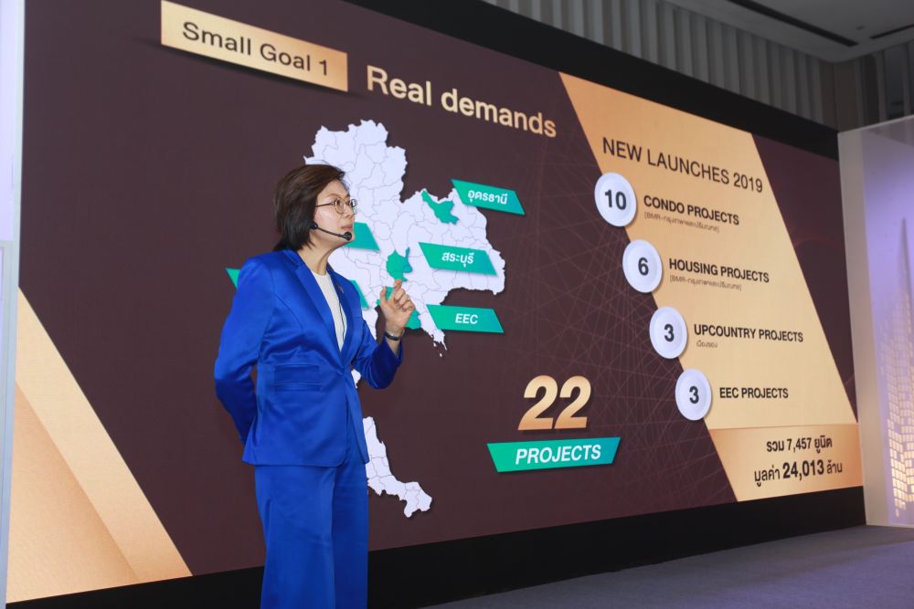 1. เดินหน้าขับเคลื่อนโปรเจกต์ทั้งปี 2019 ทั้งในกรุงเทพฯและต่างจังหวัดในกลุ่มพื้นที่ EEC รวม 22 โครงการ มูลค่ารวม 24,000 กว่าล้านบาท แบ่งเป็นโครงการแนวสูงใน กทม. 7 โครงการ และแนวราบ 7โครงการ ส่วนโครงการแนบราบต่างจังหวัดและในพื้นที่ EEC 8 โครงการ โดยตั้งเป้ายอดขาย 19,639 ล้านบาทและเป้ารายได้ 8,278 ล้านบาท