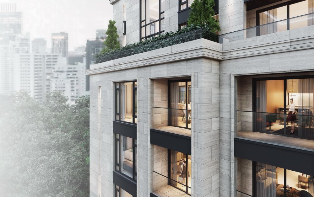 การตกแต่งทั้งภายนอกและภายใน สะท้อนให้เห็นการทำงานแบบศิลปะขั้นสูงโดยในทุกหน้าต่าง ทุกบานประตู ใช้วัสดุ กรุผนังภายนอกอาคารด้วย Limestone โทนสีครีม เป็นสีสะท้อนความคลาสสิก ร่วมสมัย ให้ความรู้สึกหรูหรา อบอุ่น น่าอยู่อาศัย เป็น ‘บ้าน’ ที่ผู้อาศัยสามารถผ่อนคลายและชาร์จพลังเพื่อออกไปสู่โลกของการทำงาน และใช้ชีวิตได้อย่างมีพลังเต็มเปี่ยม