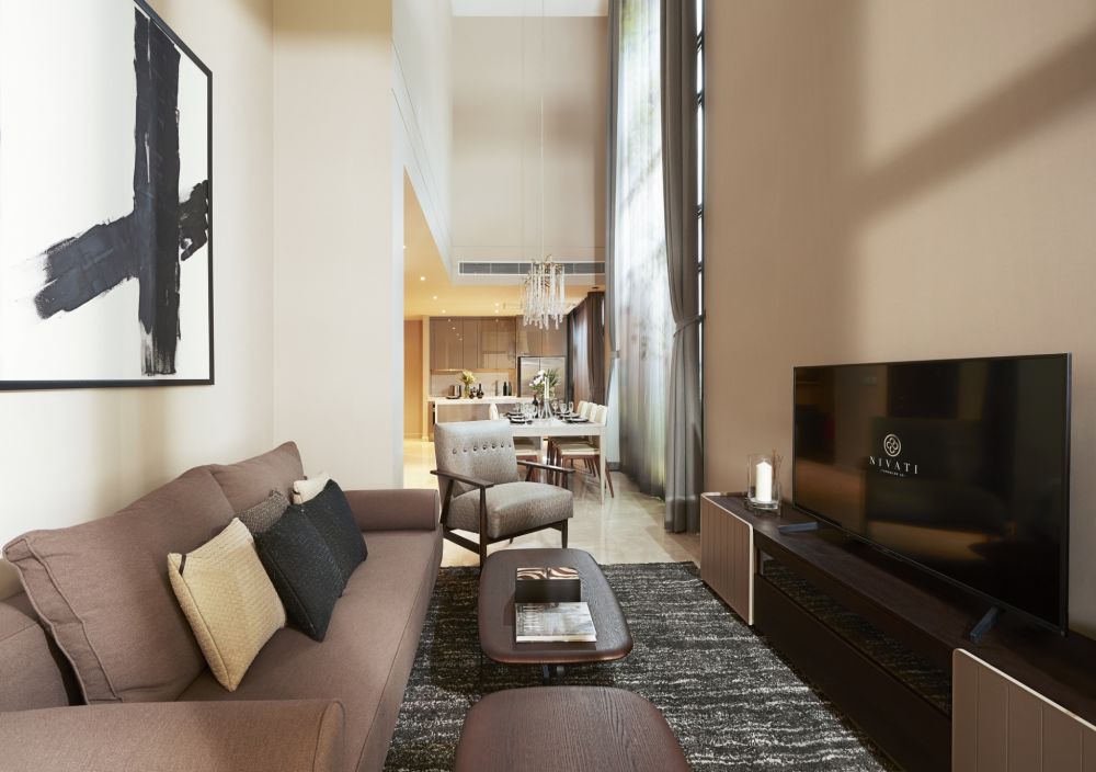 เพิ่มความหรูหราน่าครอบครอง ด้วยการตกแต่งด้วยเฟอร์นิเจอร์ลอยตัวที่มีผิวสัมผัสชั้นเลิศ อยู่แล้วสบายผ่อนคลาย โดยจะเลือกใช้สีเทา น้ำตาล ให้ความรู้สึกถึงความเนี้ยบ ความซอฟท์ในแบบธรรมชาติ ชูความโดดเด่นของวัสดุพื้นผิวและชุดครัวคุณภาพสูงตามมาตรฐานของโครงการนิวาติ