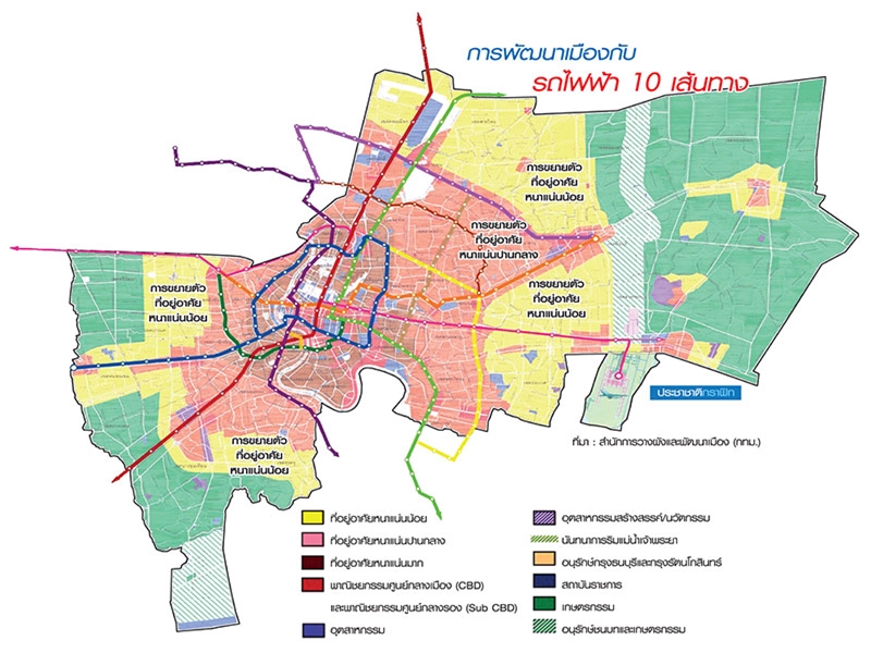 ครั้งนี้มีการนำโครงข่ายรถไฟฟ้า 10 เส้นทาง มาเป็นตัวกำหนดในการใช้ประโยชน์ที่ดิน เพื่อให้สอดรับกับการเปลี่ยนแปลงของสภาพพื้นที่ในปัจจุบัน โดยขยายพื้นที่สีน้ำตาลที่อยู่อาศัยหนาแน่นมาก พื้นที่สีส้มที่อยู่อาศัยหนาแน่นปานกลาง และพื้นที่สีเหลืองที่อยู่อาศัยหนาแน่นน้อย ไปตามการขยายตัวของเมืองและเส้นทางรถไฟฟ้า ทางโซนเหนือ ตะวันออก และตะวันตกของ กทม.