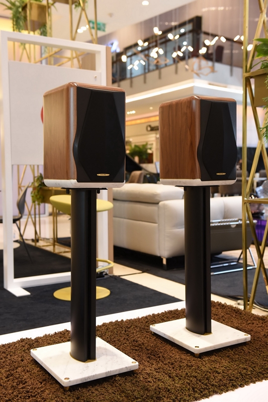 ตัวตู้ใช้วัสดุไม้วอลนัทกับหินอ่อนคาร์ราราประเทศอิตาลี แทรกด้วยเส้นทองเหลืองมัน แผงด้านหลังและแผงด้านหน้าตู้ลำโพงหุ้มด้วยหนังชั้นดี ขาตั้งเป็นอะลูมิเนียมชุบอะโนไดซ์ดำแบบพิเศษ และติดตั้งลงบนฐานหินอ่อนคาร์รารา ตอบโจทย์คนรักเสียงเพลง